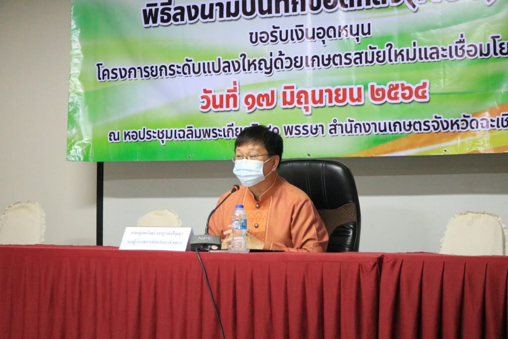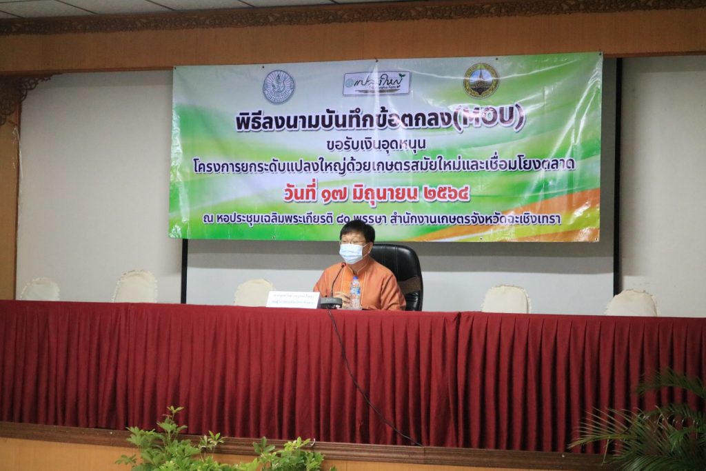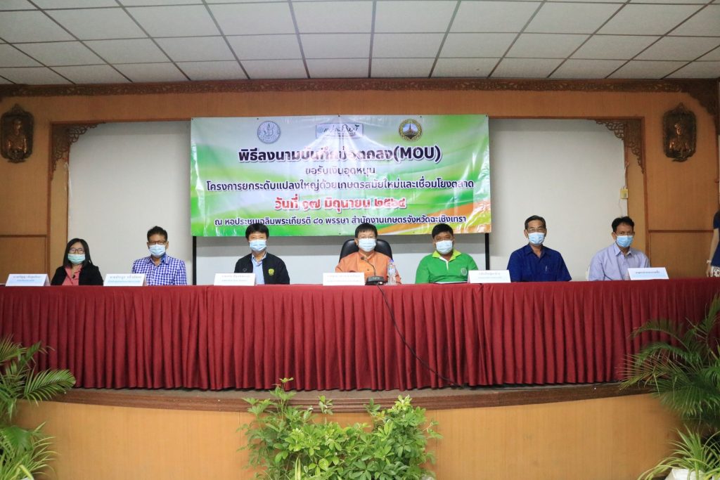 วันที่ 17 มิถุนายน 2564 เวลา 13.00 น. สำนักงานเกษตรอำเภอบางคล้า พร้อมด้วยนายสมศักดิ์ วัลลานนท์ ประธานแปลงใหญ่มะม่วงอำเภอบางคล้า ร่วมพิธีลงนามบันทึกข้อตกลง (MOU)รับเงินอุดหนุนโครงการยกระดับแปลงใหญ่ด้วยเกษตรสมัยใหม่และเชื่อมโยงตลาด ระหว่างกรมส่งเสริมการเกษตรกับเกษตรกรกลุ่มแปลงใหญ่ในจังหวัดฉะเชิงเทรา เพื่อช่วยเหลือเกษตรกรที่ได้รับผลกระทบจากการระบาดของโรคติดเชื้อไวรัสโคโรน่า 2019 และให้เกษตรกรมีการนำเทคโนโลยีและนวัตกรรมที่มีความหลากหลายมาประยุกต์ใช้ในการพัฒนาศักยภาพความเข้มแข็งในการบริหารจัดการแปลงใหญ่ โดยใช้เทคโนโลยีสมัยใหม่ ต่อยอดด้านคุณภาพมาตรฐาน แปรรูปสร้างมูลค่าเพิ่ม และเชื่อมโยงตลาด โดยมีนายพูลทรัพย์ สมบูรณ์ปัญญา รองผู้ว่าราชการจังหวัดฉะเชิงเทรา เป็นประธานในพิธี ณ หอประชุมเฉลิมพระเกียรติ 80 พรรษา สำนักงานเกษตรจังหวัดฉะเชิงเทรา