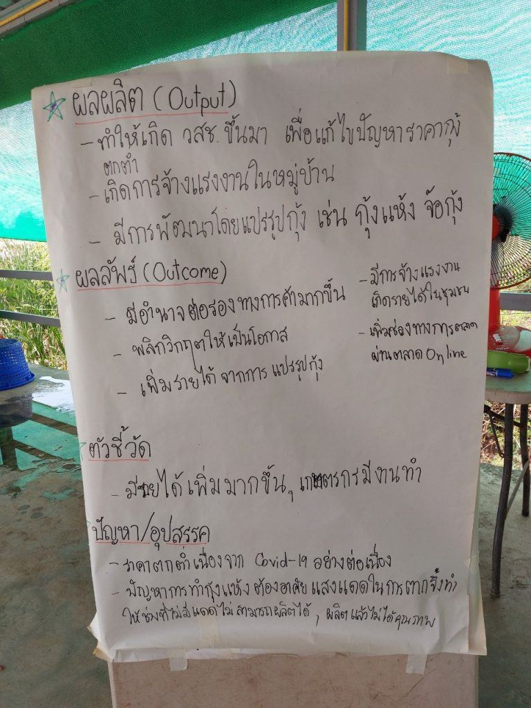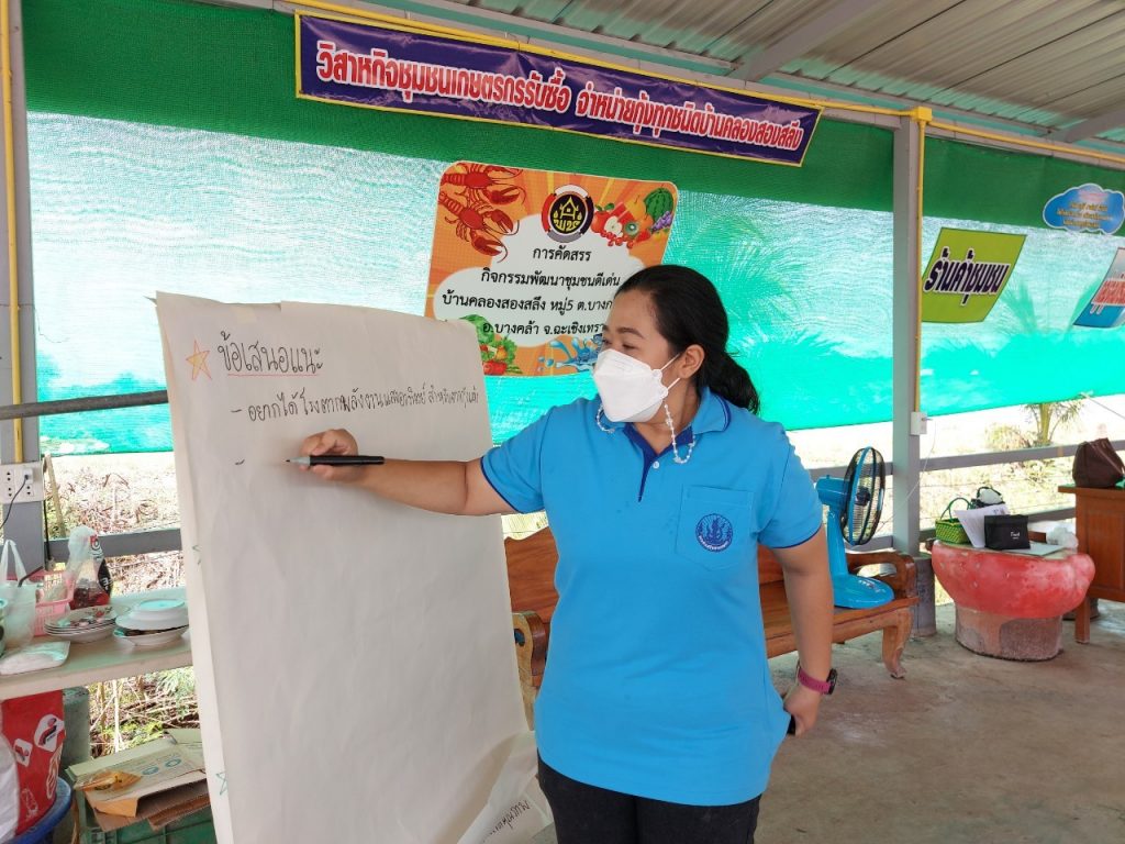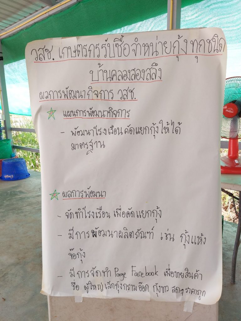วันที่ 1 กรกฎาคม 2564 เวลา 09.00 น. นายสมปอง จันทร์กุบ เกษตรอำเภอบางคล้า มอบหมายให้นางสิรินทิพย์ มีเวียงจันทร์ นักวิชาการส่งเสริมการเกษตรปฏิบัติการ ดำเนินการจัดเวทีส่งเสริมและพัฒนาวิสาหกิจชุมชน กิจกรรมย่อย ประเมินศักยภาพและจัดทำแผนพัฒนากิจการวิสาหกิจชุมชน ครั้งที่ 2 ให้แก่วิสาหกิจชุมชน เกษตรกรผู้รับซื้อและจำหน่ายกุ้งทุกชนิดบ้านคลองสองสลึง ณ ที่ทำการกลุ่มวิสาหกิจชุมชนเกษตรกรผู้จำหน่ายกุ้งทุกชนิดบ้านคลิงสองสลึง ตำบลบางกระเจ็ด อำเภอบางคล้า จังหวัดฉะเชิงเทรา