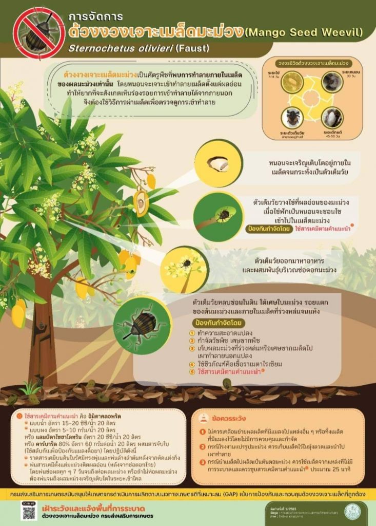 เตือนเกษตรกรและผู้ส่งออกเฝ้าระวัง “ด้วงงวงเจาะเมล็ดมะม่วง” ซึ่งเป็นแมลงปีกแข็งที่เข้าทำลายกัดกินเมล็ดภายในผลมะม่วง และเป็นอุปสรรคต่อการส่งออกมะม่วงไปต่างประเทศ ลักษณะของด้วงงวงเจาะเมล็ด