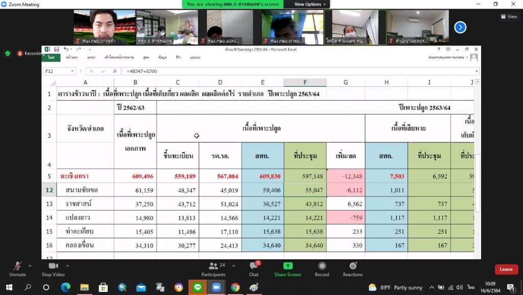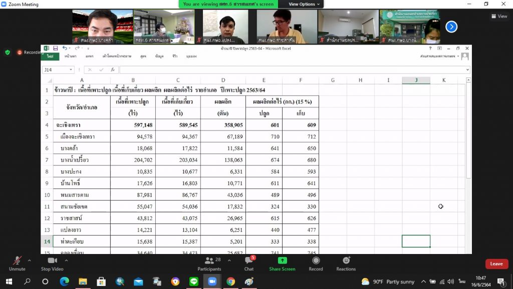 วันที่ 16 มิถุนายน 2564 เวลา 09.00 น. นายสมปอง จันทร์กุบ เกษตรอำเภอบางคล้า มอบหมายให้นายสุรวุฒิ แสนพันธ์ นักวิชาการส่งเริมการเกษตร ร่วมกับสำนักงานเศรษฐกิจการเกษตร สำนักงานเกษตรจังหวัดฉะเชิงเทรา และหน่วยงานที่เกี่ยวข้อง ร่วมประชุมหารือผลวิเคราะห์ข้อมูลเอกภาพพืชเศรษฐกิจของจังหวัดฉะเชิงเทรา ซึ่งในการประชุมในครั้งนี้ประกอบไปด้วย การวิเคราะห์ข้อมูลข้าวนาปี ข้าวโพดเลี้ยงสัตว์ ปีเพาะปลูก 2563/64 ปาล์มน้ำมัน มะพร้าว สับปะรดโรงงาน ปี 2563 ยางพารา ปี 2562-2563 และกาแฟ ปี 2564 ผ่านระบบ Zoom Meeting