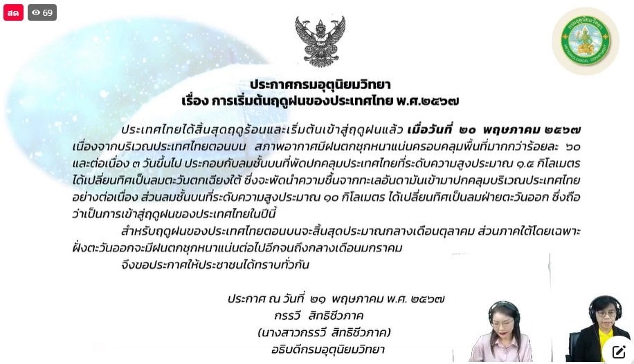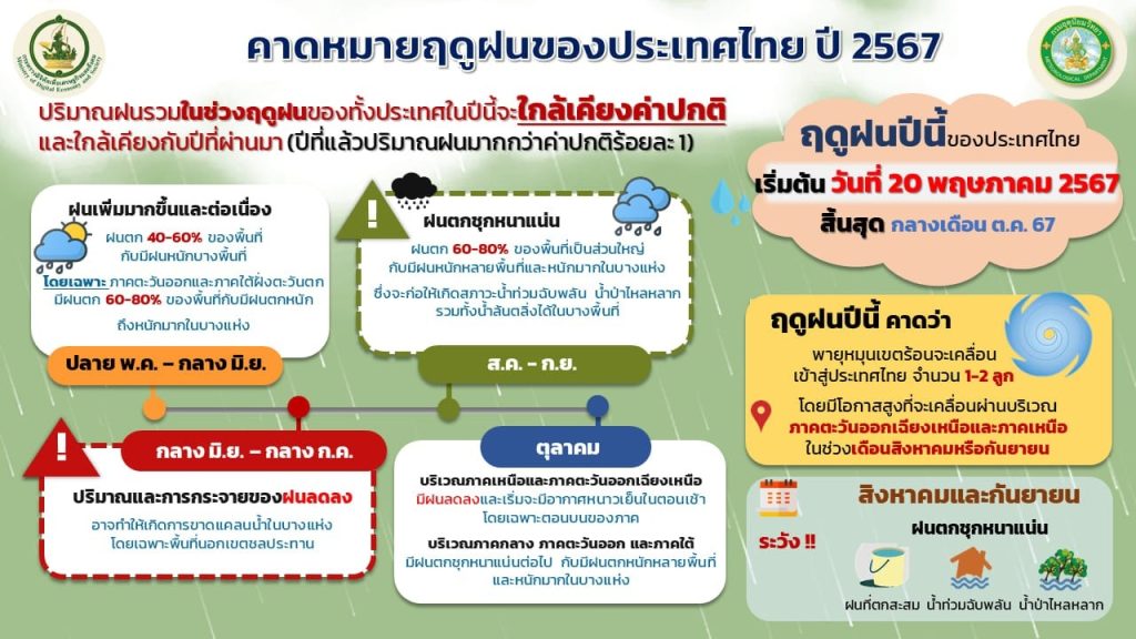 เตือนภัยธรรมชาติ ประกาศกรมอุตุนิยมวิทยา เรื่อง การเริ่มต้นฤดูฝนของประเทศไทย พ.ศ. 2567 โดยประเทศไทยได้สิ้นสุดฤดูร้อนและเริ่มต้นเข้าฤดูฝนแล้ว เมื่อวันที่ 20 พฤษภาคม 2567 21 พฤษภาคม 20246 มิถุนายน 2024 admin_BNP Related Posts เตือนภัยธรรมชาติ เตือนเกษตรกร ! เฝ้าระวังพายุฤดูร้อน มีผลกระทบระหว่างวันที่ 7 – 10 พฤษภาคม 2567 7 พฤษภาคม 20246 มิถุนายน 2024 admin_BNP เตือนภัยธรรมชาติ 6 คำแนะนำ สำหรับเกษตรกรชาวสวนไม้ผล เผชิญเหตุปัญหาภัยแล้งและความร้อน 7 พฤษภาคม 20246 มิถุนายน 2024 admin_BNP