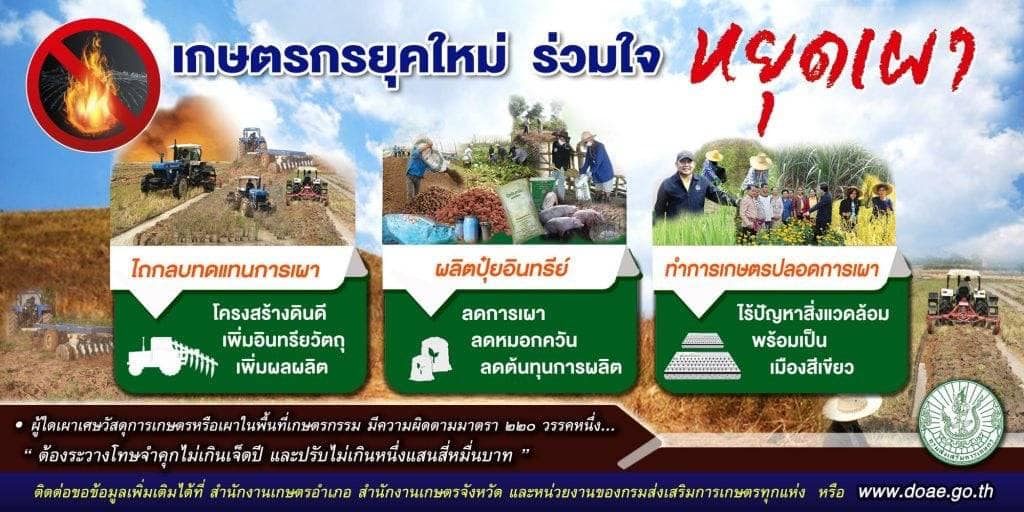 การเผาในพื้นที่การเกษตรเป็นวิธีที่เกษตรกรหลายท่านเลือกใช้เพื่อเตรียมดินและจัดการเศษซากพืช แต่การเผานั้นอาจส่งผลกระทบต่อสิ่งแวดล้อมและสุขภาพของประชาชน ดังนั้น ขอเชิญชวนทุกท่านร่วมมือกันลดการเผาในพื้นที่การเกษตรด้วยวิธีการที่เป็นมิตรกับสิ่งแวดล้อมมากขึ้น ดังนี้:ใช้เทคนิคการจัดการดินที่ยั่งยืน: ใช้การหมักปุ๋ยคอกหรือปุ๋ยชีวภาพแทนการเผาเศษซากพืช เพื่อช่วยเพิ่มความอุดมสมบูรณ์ของดินและลดการปล่อยคาร์บอน.ใช้เครื่องจักรที่เหมาะสม: ใช้เครื่องตัดหญ้าและเครื่องจักรที่สามารถย่อยเศษพืชได้ทันที โดยไม่ต้องเผาทิ้ง ซึ่งช่วยลดปริมาณการปล่อยควัน.จัดการเศษซากพืชอย่างมีประสิทธิภาพ: สามารถนำเศษซากพืชมาใช้ประโยชน์ในการผลิตปุ๋ยหมักหรือเป็นวัตถุดิบในการสร้างพลังงานทดแทน.ศึกษาและนำเสนอวิธีการใหม่: ร่วมมือกับหน่วยงานที่เกี่ยวข้องในการเรียนรู้และทดลองวิธีการเกษตรที่ไม่ใช้การเผา เช่น การปลูกพืชคลุมดิน.แจ้งปัญหาที่พบ: หากพบการเผาที่ไม่ได้รับอนุญาตหรือมีปัญหาในการจัดการเศษซากพืช สามารถแจ้งสำนักงานเกษตรอำเภอ เจ้าหน้าที่ฝ่ายปกครอง หรือผู้นำชุมชน เพื่อขอคำปรึกษาและการสนับสนุน.