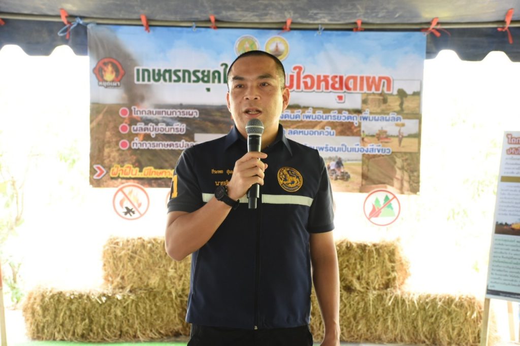 วันที่ 18 กุมภาพันธ์ 2568 นายณรงค์ ภัทรขวัญ เกษตรอำเภอบางน้ำเปรี้ยว พร้อมด้วยหน้าที่สำนักงานเกษตรอำเภอบางน้ำเปรี้ยว เจ้าหน้าที่สำนักงานเกษตรจังหวัดฉะเชิงเทรา จัดกิจกรรมโครงการรณรงค์การหยุดเผาในพื้นที่เกษตรกรรม เฝ้าระวังและแก้ไขปัญหาหมอกควันและฝุ่นละอองขนาดเล็ก (PM2.5) โดยมี นายขจรเกียรติ รักพานิชมณี ผู้ว่าราชการจังหวัดฉะเชิงเทรา เป็นประธานเปิดกิจกรรมฯ พร้อมส่วนราชการในสังกัดกระทรวงเกษตรและสหกรณ์ ป้องกันและบรรเทาสาธารณะภัยจังหวัด สารธาณสุข ฝ่ายปกครอง ทหาร ตำรวจ และเกษตรกรในพื้นที่เข้าร่วมกิจกรรม มีการออกบูทนำเสนอผลงานการจัดการเศษวัสดุเหลือใช้ทางการเกษตรในพื้นที่ของอำเภอบางน้ำเปรี้ยว ทั้งของหน่วยงานราชการ ภาคเอกชน และเกษตรกรของตำบลโพรงอากาส ดอนฉิมพลี และหนอนทอง โดยมีวัตถุประสงค์เพื่องดการเผาเศษวัสดุเหลือใช้ทางการเกษตรทดแทนการเผา ณ แปลงใหญ่ข้าวโพรงอากาศ หมู่ 13 ตำบลโพรงอากาศ อำเภอบางน้ำเปรี้ยว จังหวัดฉะเชิงเทรา