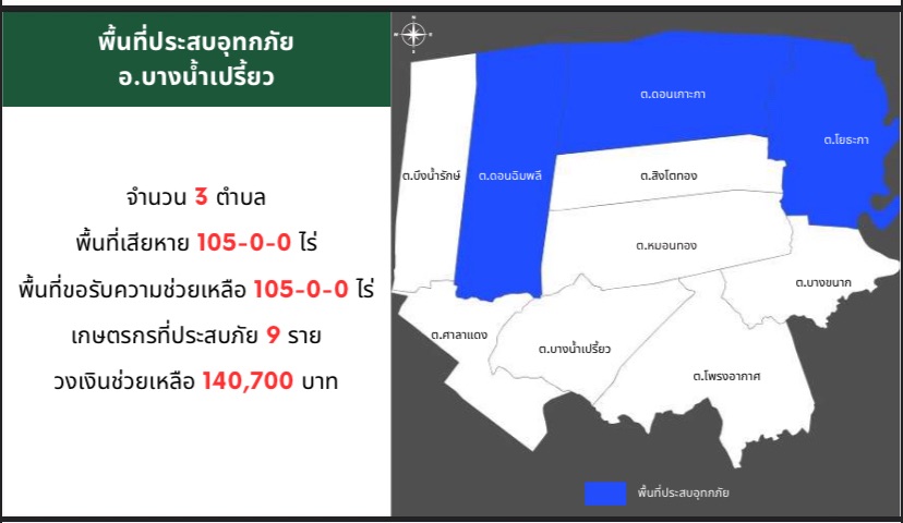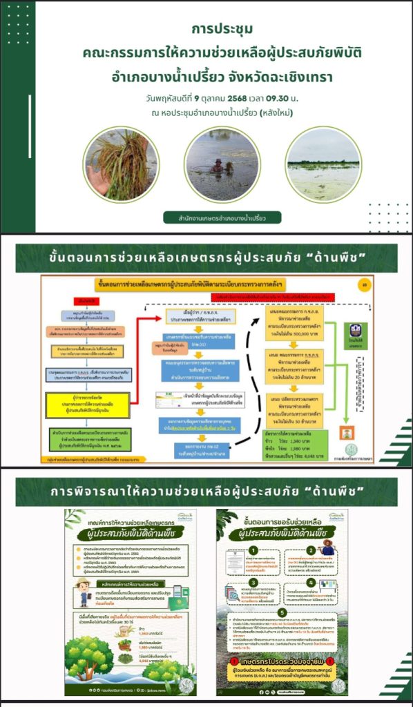 วันที่ 9 ตุลาคม 2568 นายณรงค์ ภัทรขวัญ เกษตรอำเภอบางน้ำเปรี้ยว พร้อมด้วยเจ้าหน้าที่สำนักงานเกษตรอำเภอบางน้ำเปรี้ยว เข้าร่วมประชุมคณะกรรมการให้ความช่วยเหลือผู้ประสบภัยพิบัติอำเภอบางน้ำเปรี้ยว (ก.ช.ภ.อ.) ครั้งที่ 1/2568 เพื่อพิจารณาการให้ความช่วยเหลือเกษตรกรผู้ประสบภัยพิบัติให้เป็นไปตามระเบียบกระทรวงการคลังว่าด้วยเงินทดรองราชการเพื่อช่วยเหลือผู้ประสบภัยพิบัติกรณีฉุกเฉิน พ.ศ. 2562 ทั้งนี้ อำเภอบางน้ำเปรี้ยวมีพื้นที่ประสบอุทกภัยในเขตความรับผิดชอบด้านพืช จำนวน 3 ตำบล เกษตรกรได้รับความเสียหาย จำนวน 9 ราย รวมพื้นที่เสียหาย 105 ไร่ คิดเป็นวงเงินช่วยเหลือ 140,700 บาท การประชุมดังกล่าวมี นายเกียรติศักดิ์ กาลแก้ว ปลัดอาวุโสอำเภอบางน้ำเปรี้ยว เป็นประธานการประชุม ณ หอประชุมอำเภอบางน้ำเปรี้ยว (หลังใหม่)