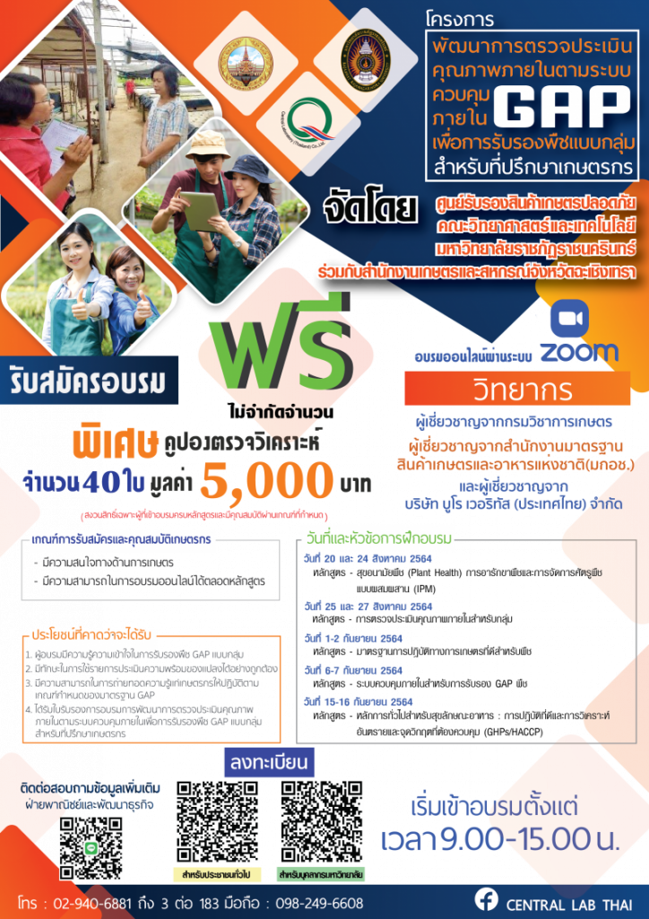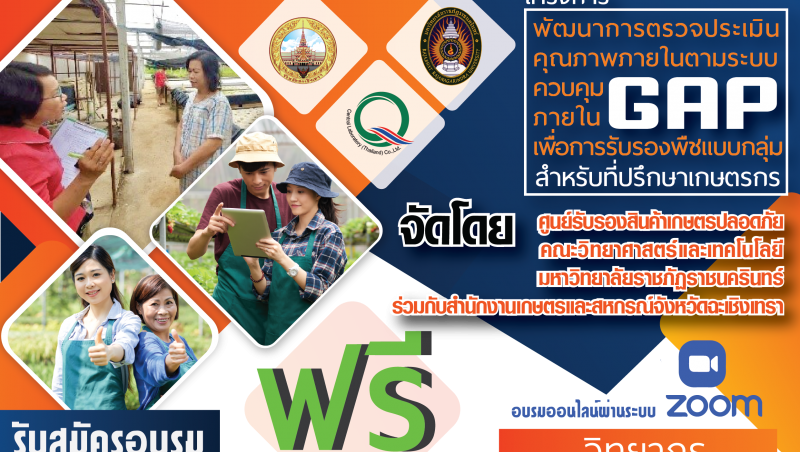 ขอเชิญผู้สนใจเข้าร่วมอบรมโครงการฝึกอบรมเชิงปฏิบัติการ หลักสูตรการตรวจประเมินคุณภาพภายในตามระบบควบคุมภายใน เพื่อการรับรองพืช GAP แบบกลุ่ม สำหรับที่ปรึกษาเกษตรกร ผ่านระบบออนไลน์ Zoom Meeting