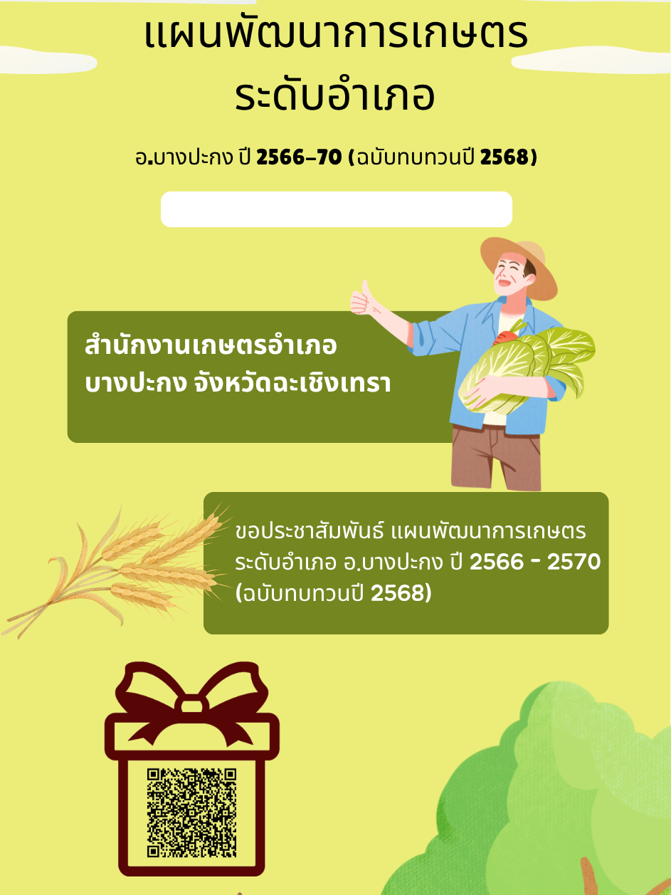 สำนักงานเกษตรอำเภอบางปะกง ขอประชาสัมพันธ์แผนพัฒนาการเกษตรระดับอำเภอ ปี 2566 – 2570 (ฉบับทบทวนปี 2568) เพื่อใช้เป็นแนวทางในการจัดทำแผนงาน โครงการ และสนับสนุนการปฏิบัติงานในการส่งเสริมการเกษตรในระดับอำเภอต่อไป
