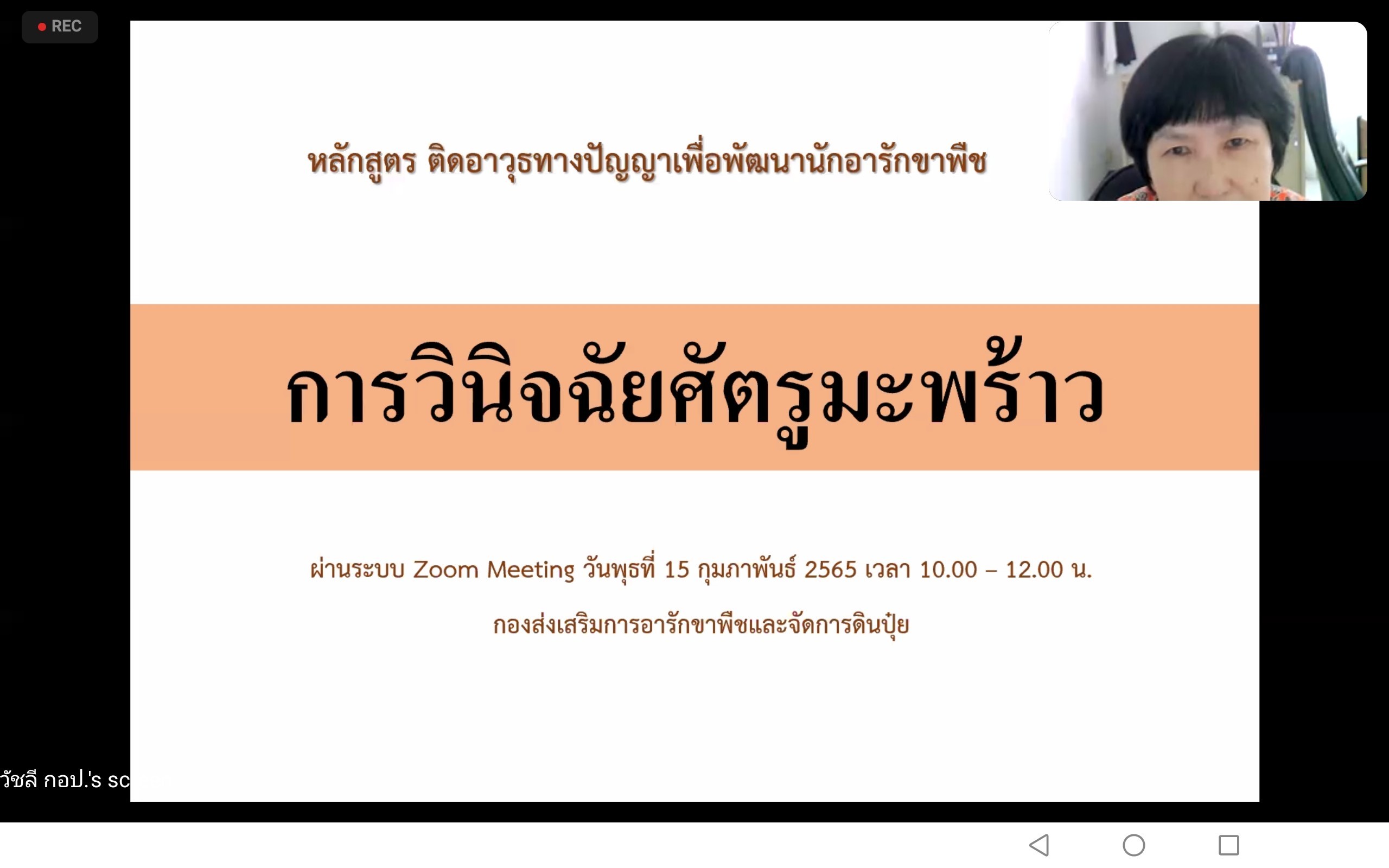 วันที่ 15 กุมภาพันธ์ 2565 เวลา 10.00 น. นายชัยยงค์ ชูจันทร์ เกษตรอำเภอบางปะกง มอบหมายให้นางสาวกิติยา รัศมี นักวิชาการส่งเสริมการเกษตรปฏิบัติการ ร่วมอบรมแผนพัฒนาศักยภาพบุคลากรด้านอารักขาพืชหลักสูตรติดอาวุธทางปัญญาเพื่อนักอารักขาพืช วิชาวินิจฉัยโรคมะพร้าว โดย ผู้เชี่ยวชาญวัชลี โสพิน กองส่งเสริมการอารักขาพืชและจัดการ ดินปุ๋ย กรมส่งเสริมการเกษตร เป็นวิทยากร ผ่านระบบออนไลน์ Zoom Meeting ณ สำนักงานเกษตรอำเภอบางปะกง จังหวัดฉะเชิงเทรา