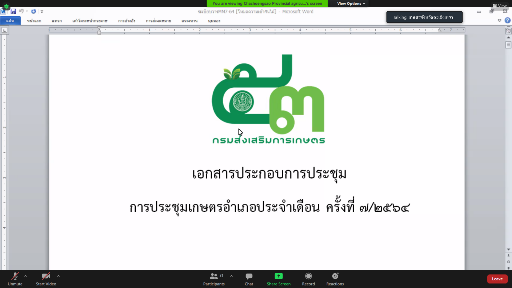 วันที่ 4 สิงหาคม 2564 นายสุนิตย์ สมประสงค์ เกษตรอำเภอเมืองฉะเชิงเทรา ร่วมประชุมเกษตรอำเภอประจำเดือน (Monthly Meeting : MM) ครั้งที่ 7/2564 ผ่านระบบการประชุมทางไกล (Video Conferrence) เพื่อร่วมรับฟังนโยบายและแนวทางการปฏิบัติงานส่งเสริมการเกษตรภายใต้สถานการณ์การระบาดของโรคติดเชื้อไวรัสโคโรน่า 2019 พร้อมทั้งชี้แจงผลการปฏิบัติงานในอำเภอเมืองฉะเชิงเทรา โดยมีนายดนัย ปัญจพิทยากุล เกษตรจังหวัดฉะเชิงเทรา เป็นประธานการประชุม ณ สำนักงานเกษตรอำเภอเมืองฉะเชิงเทรา จังหวัดฉะเชิงเทรา