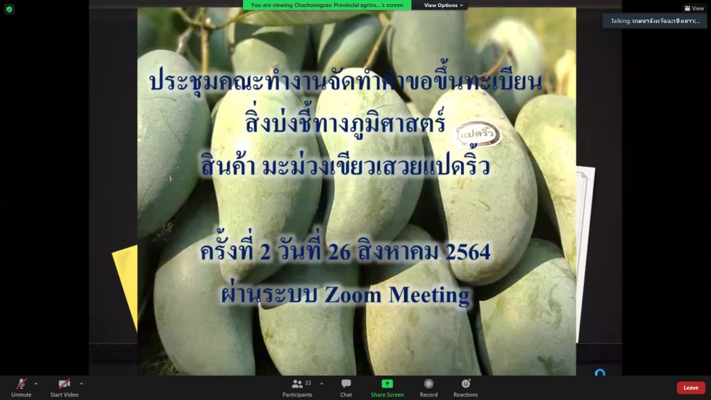 วันที่ 26 สิงหาคม 2564 นายสุนิตย์ สมประสงค์ เกษตรอำเภอเมืองฉะเชิงเทรา พร้อมด้วยนางสาววิยดา ไชยชนันท์ ตัวแทนเกษตรกรผู้ปลูกมะม่วงเขียวเสวยอำเภอเมืองฉะเชิงเทรา เข้าร่วมประชุมคณะทำงานสิ่งบ่งชี้ทางภูมิศาสตร์ จังหวัดฉะเชิงเทรา สินค้า มะม่วงเขียวเสวยแปดริ้ว ครั้งที่ 2 ทางระบบ Zoom Meeting เพื่อพิจารณาจัดทำร่างคำขอขึ้นทะเบียนสิ่งบ่งชี้ทางภูมิศาสตร์ (Geographical Indication : GI) ร่างคู่มือปฏิบัติงานสำหรับสมาชิกผู้ขอใช้สิ่งบ่งชี้ทางภูมิศาสตร์ และร่างแผนการควบคุมตรวจสอบสินค้าสิ่งบ่งชี้ทางภูมิศาสตร์ ณ สำนักงานเกษตรอำเภอเมืองฉะเชิงเทรา จังหวัดฉะเชิงเทรา
