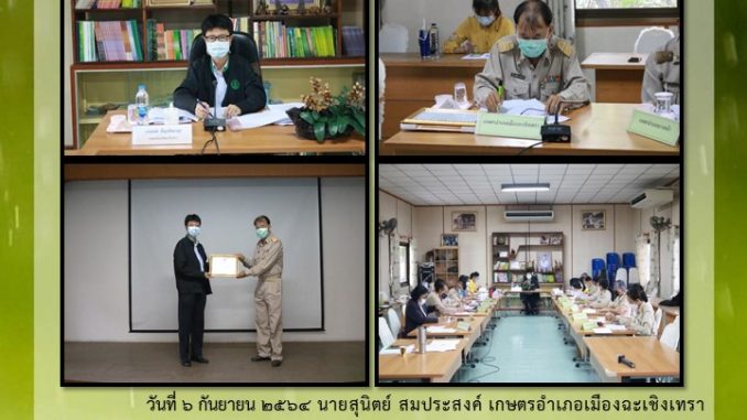 วันที่ 6 กันยายน 2564 นายสุนิตย์ สมประสงค์ เกษตรอำเภอเมืองฉะเชิงเทรา ร่วมประชุมเกษตรอำเภอประจำเดือน (Monthly Meeting : MM) ครั้งที่ 8/2564 เพื่อร่วมรับฟังแนวทางการปฏิบัติงานด้านส่งเสริมการเกษตร รวมทั้งรับฟังรายละเอียดการเบิกจ่ายโครงการฯ ประจำปีงบประมาณ พ.ศ. 2564 พร้อมทั้งชี้แจงผลการปฏิบัติงาน และเป็นตัวแทนอำเภอเมือง รับมอบประกาศนียบัตรหลักสูตร “พัฒนาเกษตรกรเป็นผู้จัดการแปลง” โครงการระบบส่งเสริมการเกษตรแบบแปลงใหญ่ โดยมีนายดนัย ปัญจพิทยากุล เกษตรจังหวัดฉะเชิงเทรา เป็นประธานการประชุม ณ หอประชุมเฉลิมพระเกียรติ 80 พรรษา สำนักงานเกษตรจังหวัดฉะเชิงเทรา