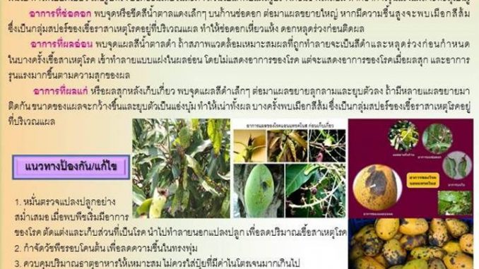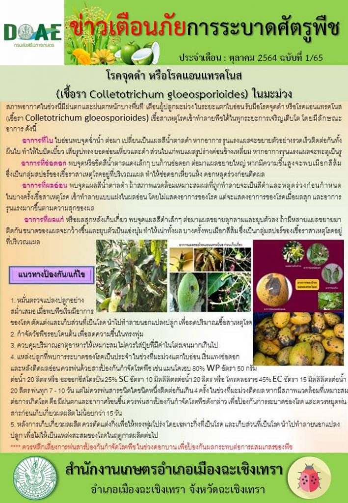 โรคใบจุดดำ หรือโรคแอนแทรคโนส (เชื้อรา Colletotrichum gloeosporioides) ในมะม่วง 5 พฤศจิกายน 2021 admin_cha ข่าวเตือนภัย 0