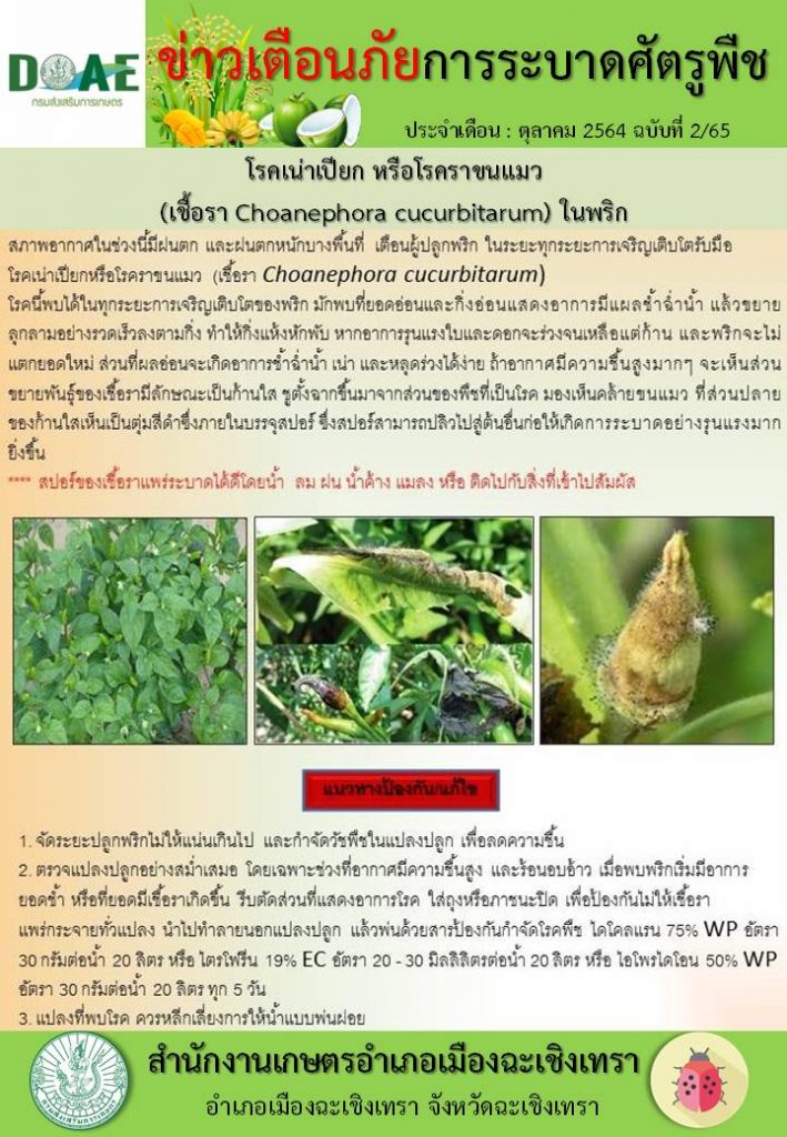 โรคเน่าเปียก หรือโรคราขนแมว (เชื้อรา Choanephora cucurbitarum) ในพริก 5 พฤศจิกายน 2021 admin_cha ข่าวเตือนภัย 0