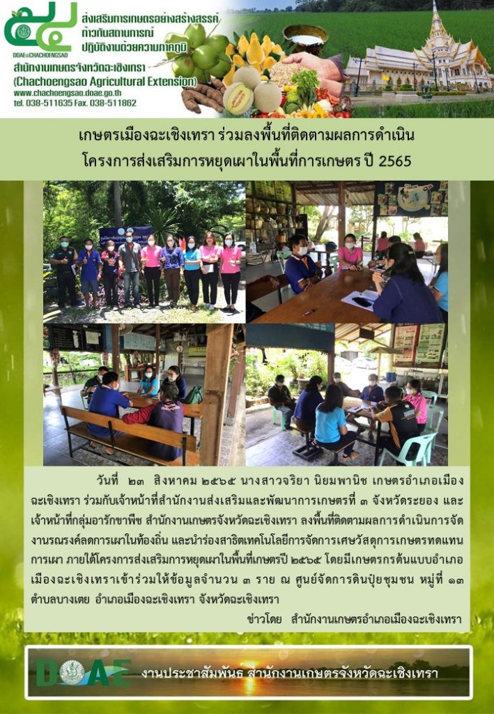 เกษตรเมืองฉะเชิงเทรา ร่วมลงพื้นที่ติดตามผลการดำเนินโครงการส่งเสริมการหยุดเผาในพื้นที่การเกษตร ปี 2565 24 สิงหาคม 2022 admin_cha ข่าวทั่วไป 0