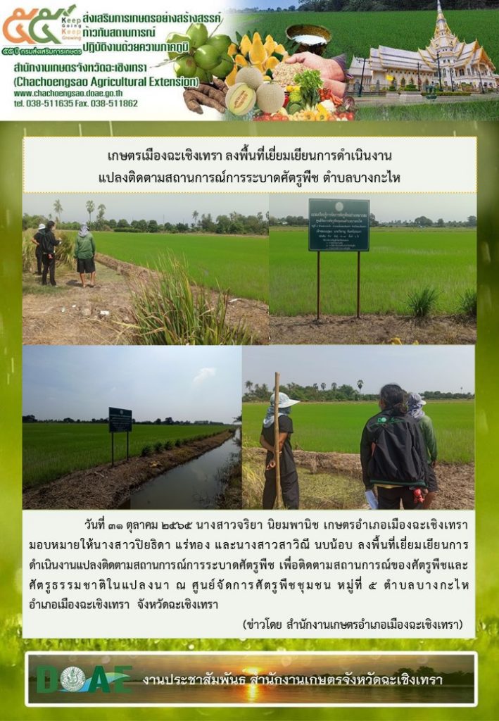 เกษตรเมืองฉะเชิงเทรา ลงพื้นที่เยี่ยมเยียนการดำเนินงานแปลงติดตามสถานการณ์การระบาดศัตรูพืช ตำบลบางกะไห 31 ตุลาคม 2022 admin_cha ข่าวทั่วไป 0