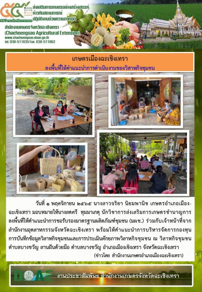 เกษตรเมืองฉะเชิงเทรา ลงพื้นที่ให้คำแนะนำการดำเนินงานของวิสาหกิจชุมชน 1 พฤศจิกายน 2022 admin_cha ข่าวทั่วไป 0