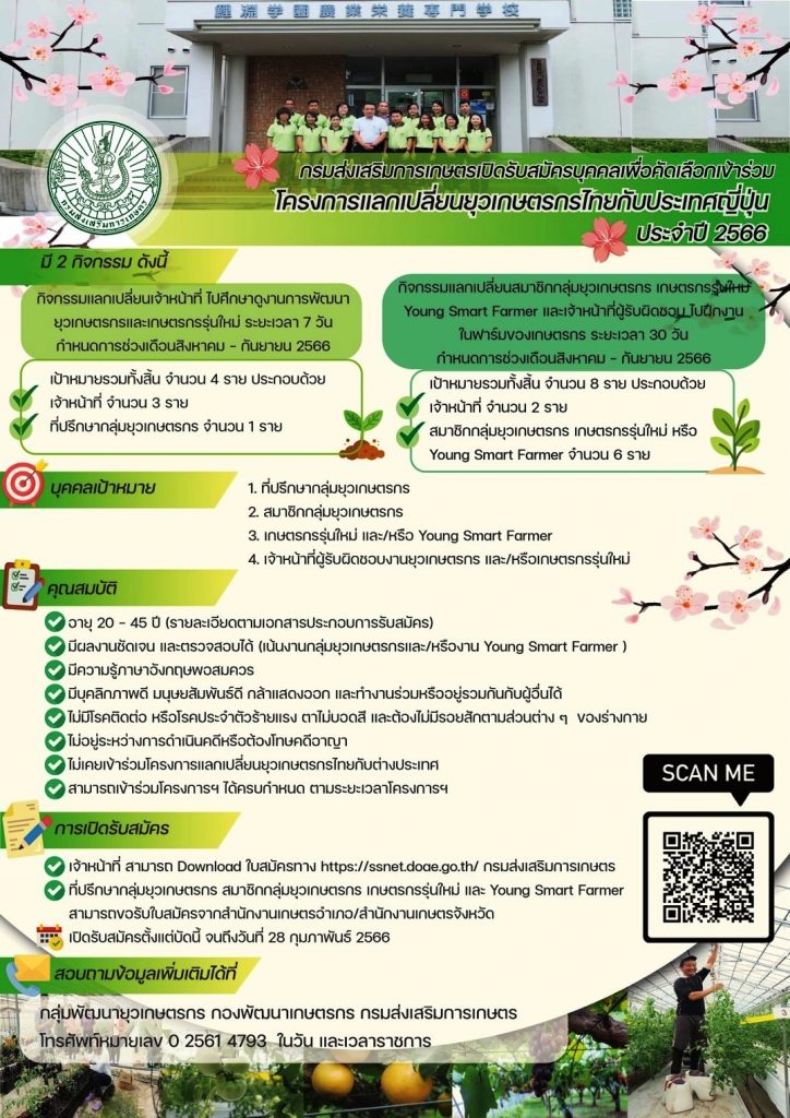 โครงการแลกเปลี่ยนยุวเกษตรกรไทยกับต่างประเทศ ประจำปี 2566 กิจกรรมการแลกเปลี่ยนยุวเกษตรกร เกษตรกร และเจ้าหน้าที่ผู้รับผิดชอบกับประเทศญี่ปุ่น สำหรับ ที่ปรึกษากลุ่มยุวเกษตรกร สมาชิกกลุ่มยุวเกษตรกร เกษตรกรรุ่นใหม่ และ Young Smart Farmer 26 มกราคม 2023 admin_cha ข่าวทั่วไป 0