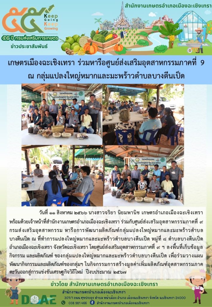 วันที่ 11 สิงหาคม 2566 นางสาวจริยา นิยมพานิช เกษตรอำเภอเมืองฉะเชิงเทราพร้อมด้วยเจ้าหน้าที่สำนักงานเกษตรอำเภอเมืองฉะเชิงเทรา ร่วมกับศูนย์ส่งเสริมอุตสาหกรรมภาคที่ 9 กรมส่งเสริมอุตสาหกรรม หารือการพัฒนาผลิตภัณฑ์กลุ่มแปลงใหญ่หมากและมะพร้าวตำบลบางตีนเป็ด โดยศูนย์ส่งเสริมอุตสาหกรรมภาคที่ 9 ฯ ลงพื้นที่เก็บข้อมูลกิจกรรม และผลิตภัณฑ์ ของกลุ่มแปลงใหญ่หมากและมะพร้าวตำบลบางตีนเป็ด เพื่อร่วมวางแผนพัฒนากิจกรรมและผลิตภัณฑ์ของกลุ่มฯ ณ ที่ทำการแปลงใหญ่หมากและมะพร้าวตำบลบางตีนเป็ด อำเภอเมืองฉะเชิงเทรา จังหวัดฉะเชิงเทรา