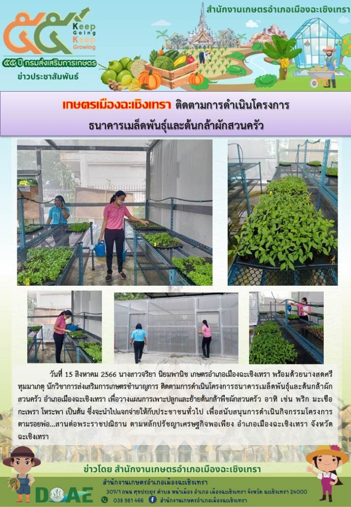 วันที่ 15 สิงหาคม 2566 นางสาวจริยา นิยมพานิช เกษตรอำเภอเมืองฉะเชิงเทรา พร้อมด้วยนางสดศรี ทุมมาเกตุ นักวิชาการส่งเสริมการเกษตรชำนาญการ ติดตามการดำเนินโครงการธนาคารเมล็ดพันธุ์และต้นกล้าผักสวนครัว อำเภอเมืองฉะเชิงเทรา เพื่อวางแผนการเพาะปลูกและย้ายต้นกล้าพืชผักสวนครัว อาทิ เช่น พริก มะเขือ กะเพรา โหระพา เป็นต้น ซึ่งจะนำไปแจกจ่ายให้กับประชาชนทั่วไป เพื่อสนับสนุนการดำเนินกิจกรรมโครงการตามรอยพ่อ…สานต่อพระราชปณิธาน ตามหลักปรัชญาเศรษฐกิจพอเพียง อำเภอเมืองฉะเชิงเทรา จังหวัดฉะเชิงเทรา