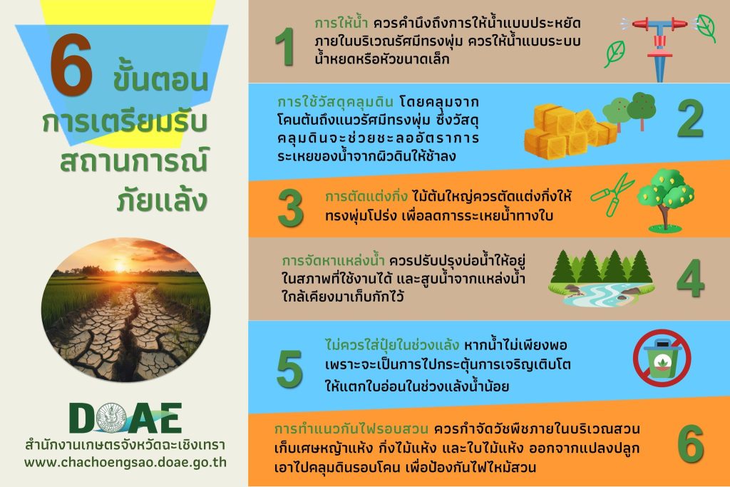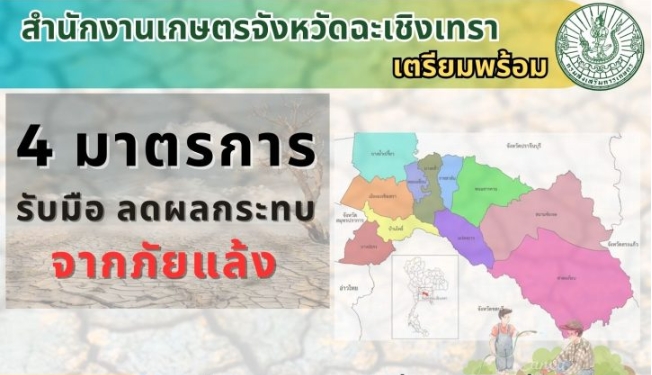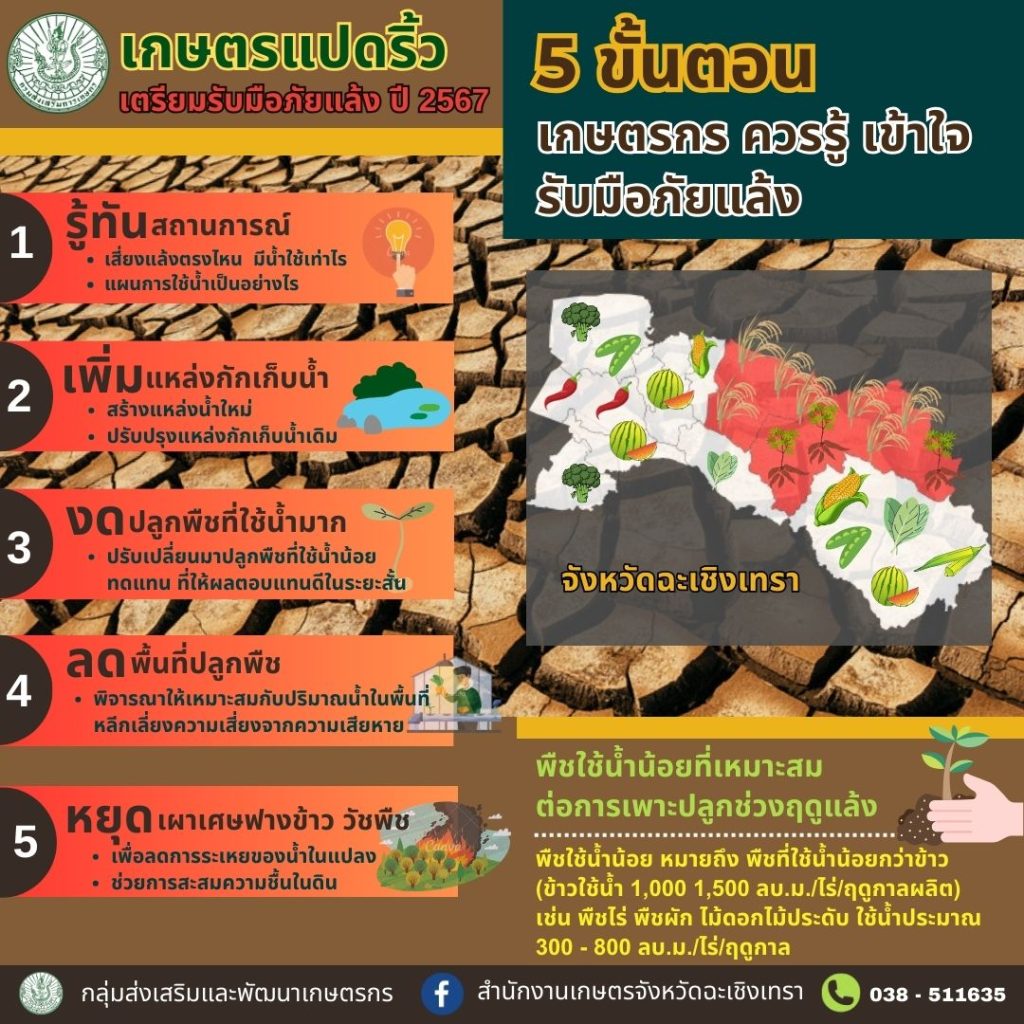 เกษตรแปดริ้ว กำหนดมาตรการลดผลกระทบ และขั้นตอนในการรับมือกับสถานการณ์ภัยแล้ง“4 มาตรการ 5 ขั้นตอน ในการรับมือสถานการณ์ภัยแล้ง ปี 2567” จากปรากฎการณ์ “เอลนีโญ่” ที่ประเทศไทยเริ่มได้รับผลกระทบมาตั้งแต่เดือนมิถุนายน 2566 และคาดการณ์ว่าสถานการณ์ดังกล่าวจะมีระยะยาวถึงเดือนกุมภาพันธ์ 2567 ซึ่งจะส่งผลให้สภาพอากาศมีอุณหภูมิเฉลี่ยสูงขึ้น และในหลายจังหวัดอาจจะประสบปัญหาภัยแล้ง และปัญหาน้ำเค็มเข้ารุกพื้นที่การเกษตร ที่จะส่งผลกระทบต่อปริมาณน้ำเพื่อการเกษตร และทำให้พืชผลผลิตทางการเกษตรได้รับความเสียหายได้เพื่อเป็นการเตรียมความพร้อม รับมือกับสถานการณ์ “เอลนีโญ่” ที่จะส่งผลให้เกิดสภาวะภัยแล้ง สำนักงานเกษตรจังหวัดฉะเชิงเทรา จึงได้ประชาสัมพันธ์ แจ้งเตือนสถานการณ์ กำหนดมาตรการลดผลกระทบ และขั้นตอนในการรับมือกับสถานการณ์ภัยแล้ง โดยการนำ “4 มาตรการ 5 ขั้นตอน ในการรับมือสถานการณ์ภัยแล้ง ปี 2567” แจ้งให้พี่น้องเกษตรกรได้รับทราบ ซึ่งจะทำให้เกษตรกรสามารถวางแผนรับมือต่อการผลิตทางการเกษตรได้อย่างทันท่วงที ลดการสูญเสียรายจ่าย และรู้จักปรับตัวให้ทันต่อสถานการณ์ที่เกิดขึ้นสามารถสอบถามข้อมูลเพิ่มเติมได้ที่ สำนักงานเกษตรจังหวัดฉะเชิงเทรา และสำนักงานเกษตรอำเภอทุกที่ใกล้บ้านท่าน