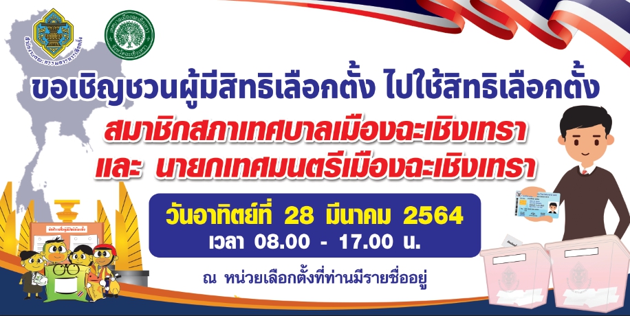 การเลือกตั้งสมาชิกสภาเทศบาลและนายกเทศมนตรี 10 มีนาคม 2021 admin_cha ข่าวทั่วไป 0 ประชาสัมพันธ์ข้อมูลข่าวสารเกี่ยวกับการเลือกตั้งสมาชิกสภาเทศบาลและนายกเทศมนตรี ซึ่งในเขตอำเภอเมืองฉะเชิงเทรามี 2 เขตเทศบาล คือ เทศบาลเมืองฉะเชิงเทรา และเทศบาลตำบลนครเนื่องเขต ในวันที่ 28 มีนาคม 2564 เวลา 8.00 – 17.00 น. ณ หน่วยเลือกตั้งที่ท่านมีรายชื่ออยู่