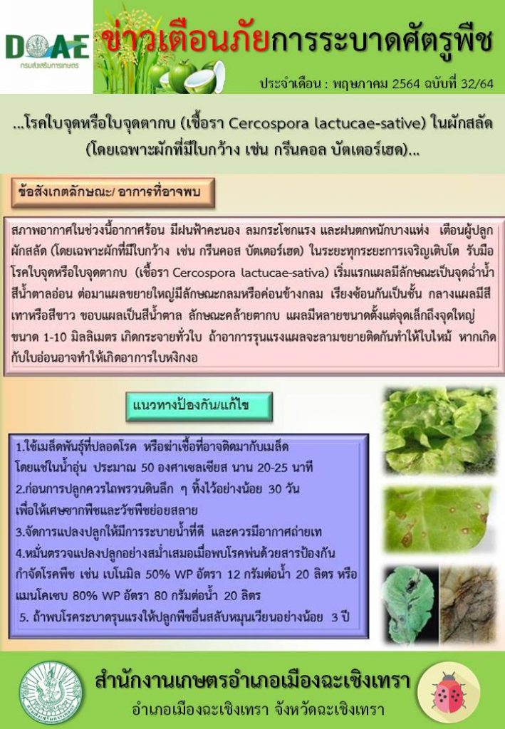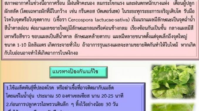 โรคใบจุดหรือใบจุดตากบ (เชื้อรา Cercospora lactucae-sative) ในผักสลัด (โดยเฉพาะผักที่มีใบกว้าง เช่น กรีนคอล บัตเตอร์เฮด) 19 กรกฎาคม 2021 admin_cha ข่าวเตือนภัย 0