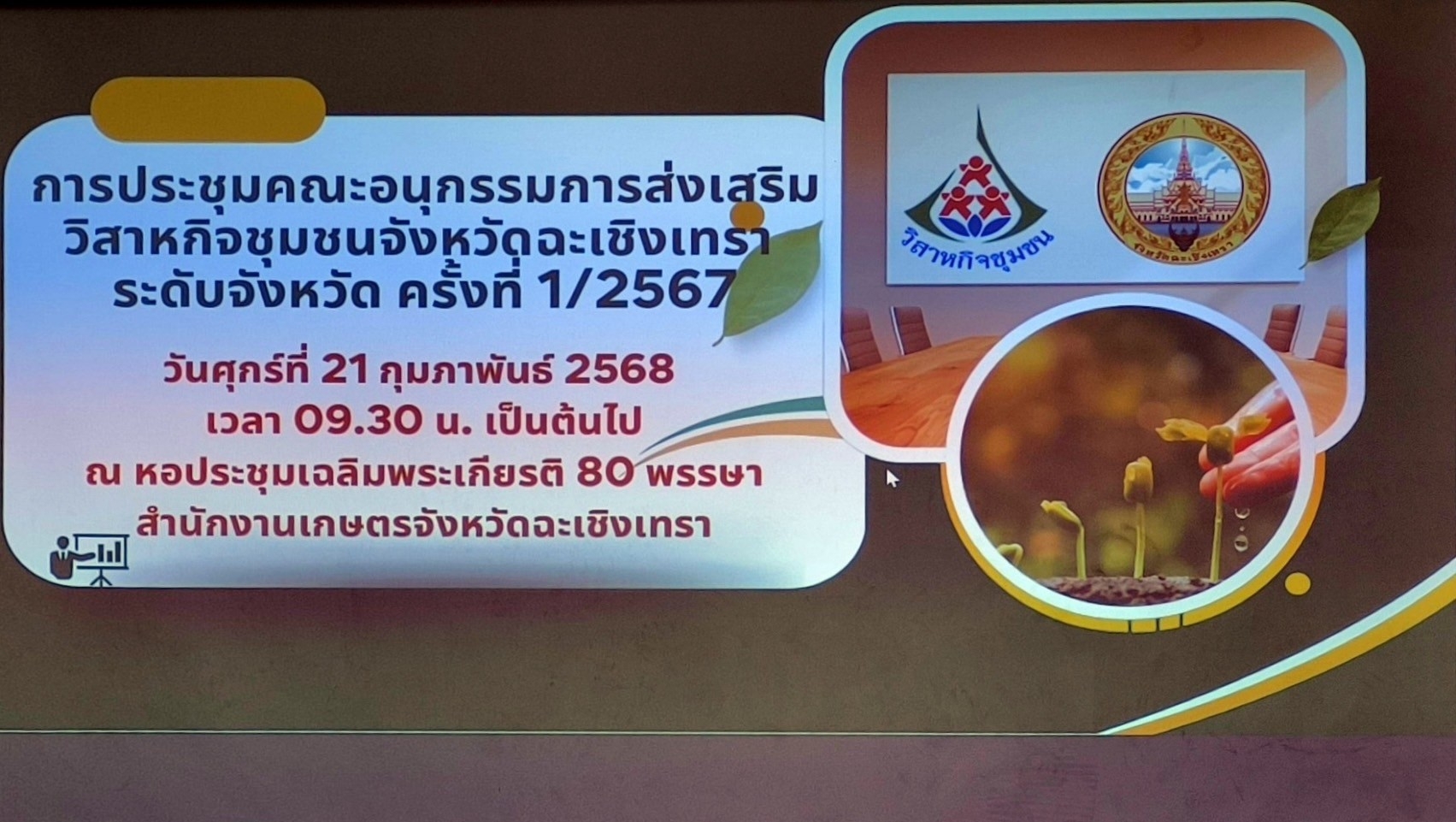 สำนักงานเกษตรจังหวัดฉะเชิงเทรา โดยนายดนัย ปัญจพิทยากุล เกษตรจังหวัดฉะเชิงเทรา ในฐานะประธานคณะอนุกรรมการส่งเสริมวิสาหกิจชุมชนจังหวัดฉะเชิงเทรา พร้อมด้วยนางวิภา จิระวัฒน์ หัวหน้ากลุ่มส่งเสริมและพัฒนาเกษตรกร อนุกรรมการและเลขานุการ และเจ้าหน้าที่กลุ่มส่งเสริมและพัฒนาเกษตรกร ได้ดำเนินการจัดประชุมคณะอนุกรรมการส่งเสริมวิสาหกิจชุมชนจังหวัดฉะเชิงเทรา ครั้งที่ 1/2568 โดยมีวัตถุประสงค์เพื่อสร้างกลไกขับเคลื่อน และสนับสนุนการปฏิบัติงานของคณะกรรมการส่งเสริมวิสาหกิจชุมชนจังหวัดในระดับพื้นที่ให้เกิดการประสานความร่วมมือระหว่างคณะกรรมการส่งเสริมวิสาหกิจชุมชนจังหวัดกับหน่วยงานในระดับอำเภอ จังหวัด ผู้ประกอบการวิสาหกิจชุมชน และภาคีต่าง ๆ โดยมีคณะอนุกรรมการส่งเสริมวิสาหกิจชุมชนจังหวัดฉะเชิงเทรา และเจ้าหน้าที่ผู้เกี่ยวข้องเข้าร่วมประชุมฯ จำนวน 20 ราย ณ ชุมเฉลิมพระเกียรติ 80 พรรษา สำนักงานเกษตรจังหวัดฉะเชิงเทรา