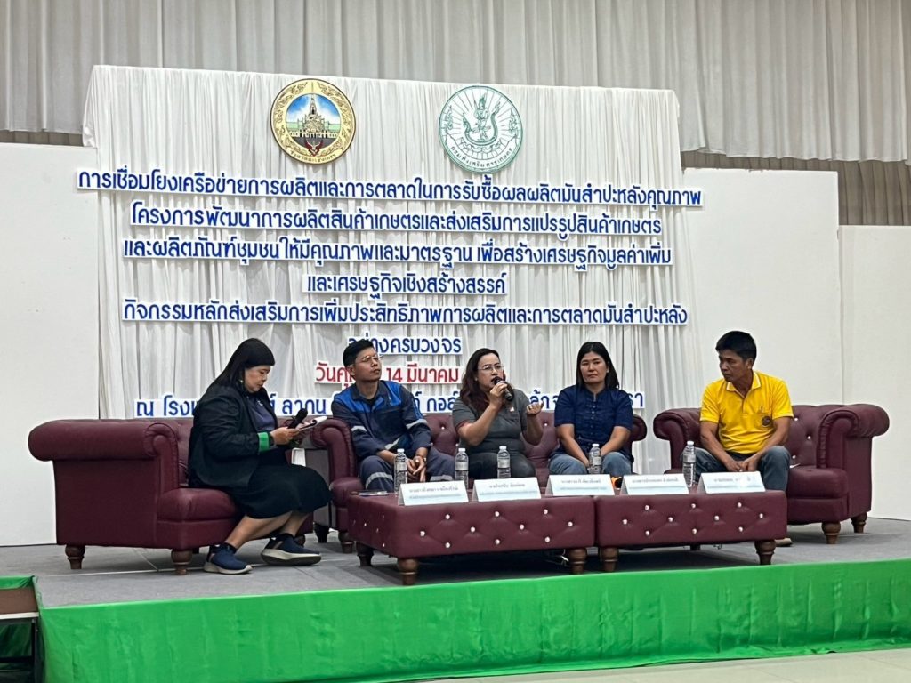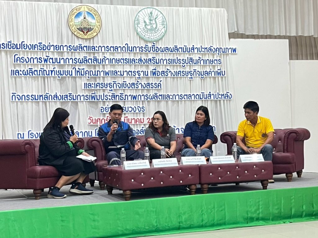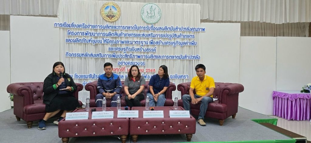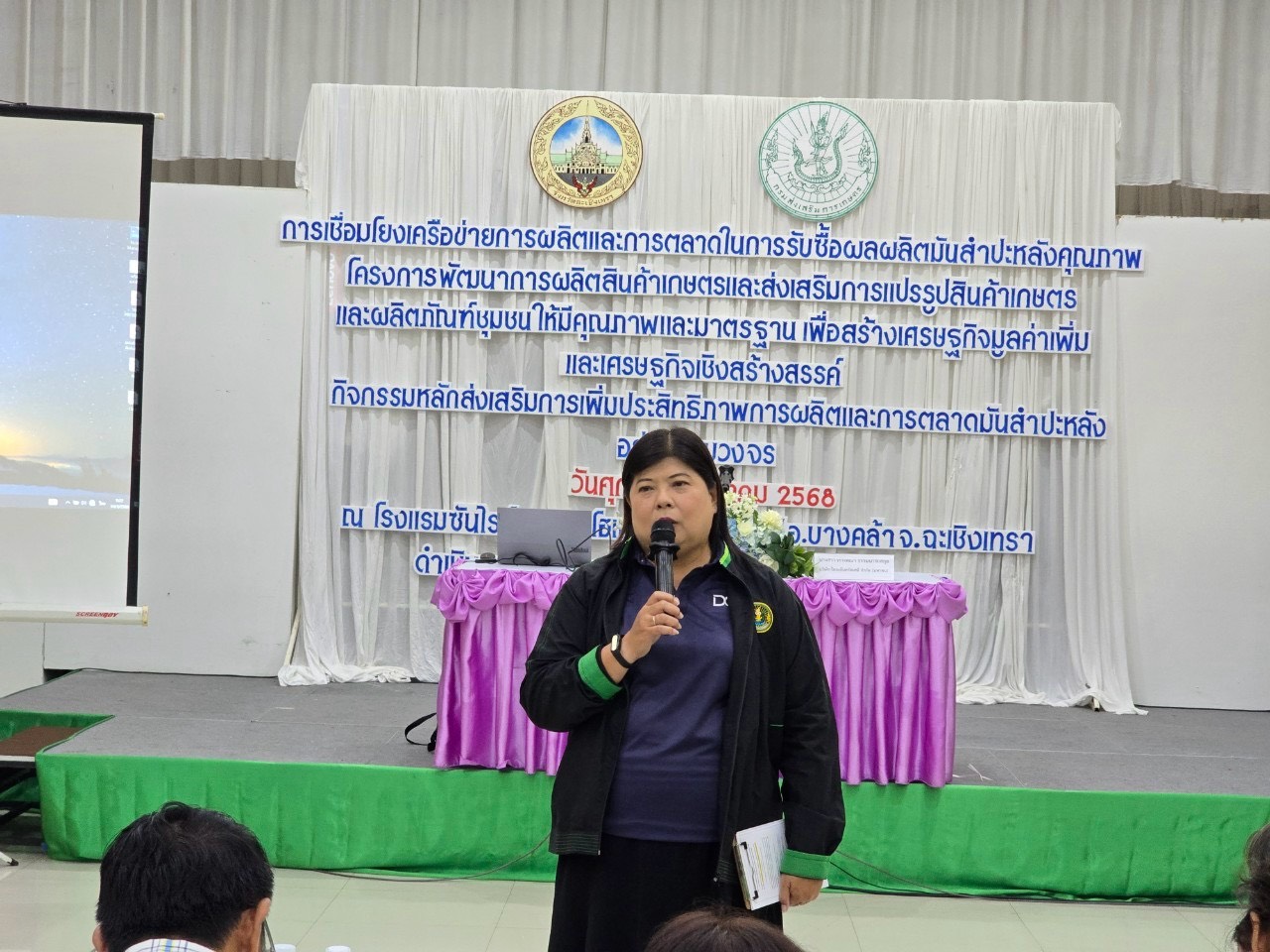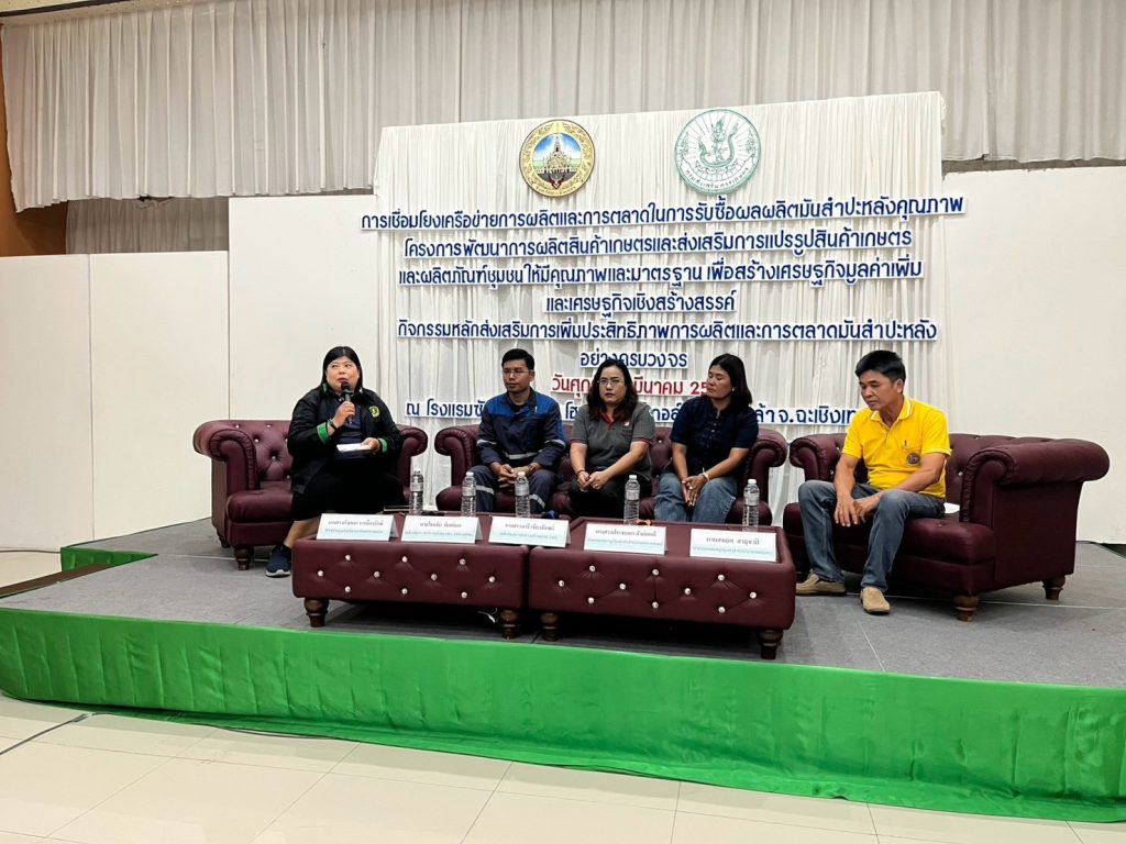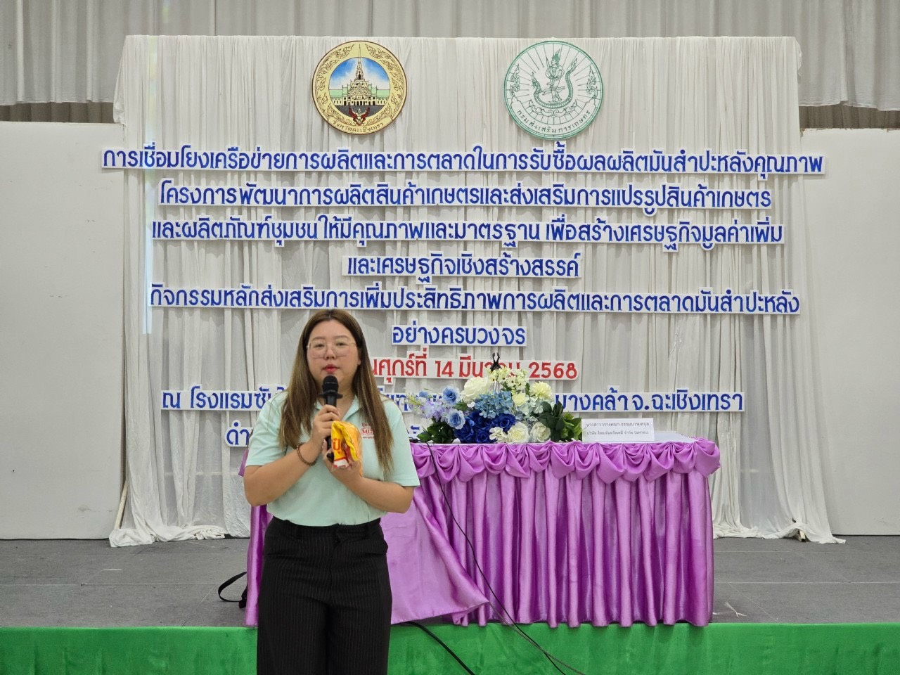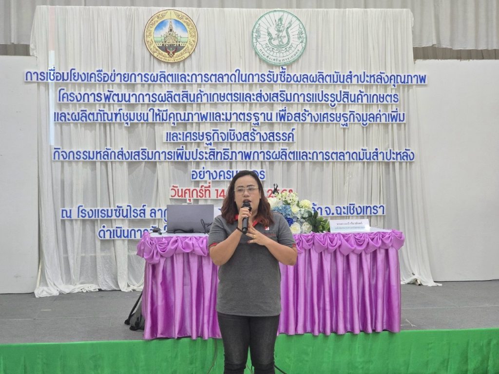 สำนักงานเกษตรจังหวัดฉะเชิงเทรา โดยนายดนัย ปัญจพิทยากุล เกษตรจังหวัดฉะเชิงเทรา เป็นประธานเปิดการจัดกิจกรรมเชื่อมโยงเครือข่ายการผลิต และตลาดในการรับซื้อผลผลิตมันสำปะหลังคุณภาพ ภายใต้โครงการพัฒนาการผลิตสินค้าเกษตรและส่งเสริมการแปรรูปสินค้าเกษตรและผลิตภัณฑ์ชุมชนให้มีคุณภาพและมาตรฐาน เพื่อสร้างเศรษฐกิจมูลค่าเพิ่มและเศรษฐกิจเชิงสร้างสรรค์ กิจกรรมหลัก ส่งเสริมการเพิ่มประสิทธิภาพการผลิตและการตลาด มันสำปะหลังอย่างครบวงจร ณ โรงแรมซันไรส์ ลากูน โฮเทลแอนด์กอล์ฟ อำเภอบางคล้า จังหวัดฉะเชิงเทรา โดยมอบหมายให้ นางสาวอังคณา นาเมืองรักษ์ หัวหน้ากลุ่มส่งเสริมและพัฒนาการผลิต พร้อมด้วยนางสาวศรีวรรณ เลอสรวง นักวิชาการส่งเสริมการเกษตรชำนาญการ และเจ้าหน้าที่สำนักงานเกษตรจังหวัดฉะเชิงเทรา ดำเนินการจัดกิจกรรมดังกล่าว มีวัตถุประสงค์เพื่อให้เกษตรกรผู้ปลูกมันสำปะหลัง ได้เชื่อมโยงการตลาดกับ บริษัท ผู้รับซื้อผลผลิตมันสำปะหลัง เกิดการแลกเปลี่ยนเรียนรู้การผลิต และเกิดการเชื่อมโยงเครือข่ายด้านการตลาดในอนาคตต่อไป ซึ่งได้รับเกียรติจาก บริษัท ไทยเซนทรัลเคมี จำกัด (มหาชน) บริษัท เอส.ซี.อินดัสทรี จำกัด บริษัท ดับเบิ้ลเอ (1991) จำกัด (มหาชน) และบริษัท โซจิทสึ เกษตร ดี เอ็กซ์ จำกัด เข้าร่วมจัดแสดงนิทรรศการ บรรยาย ให้ความรู้ และร่วมเจรจาธุรกิจ ทั้งนี้ มีเกษตรกรผู้ปลูกมันสำปะหลัง อำเภอแปลงยาว และอำเภอสนามชัยเขต และเจ้าหน้าที่สำนักงานเกษตรอำเภอที่เกี่ยวข้อง เข้าร่วมกิจกรรมรวมจำนวน 70 ราย