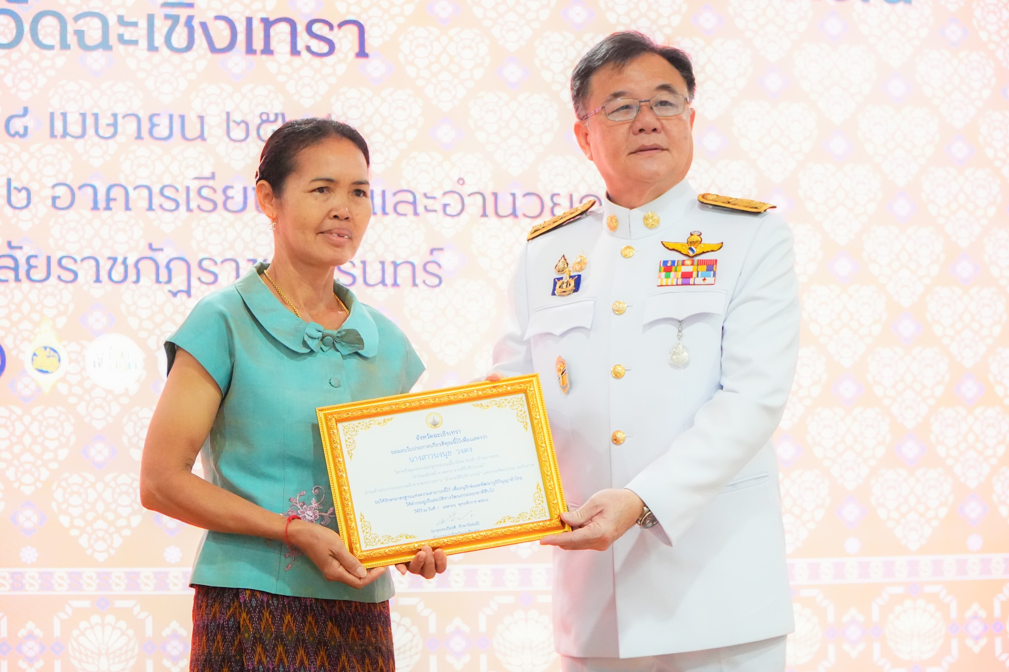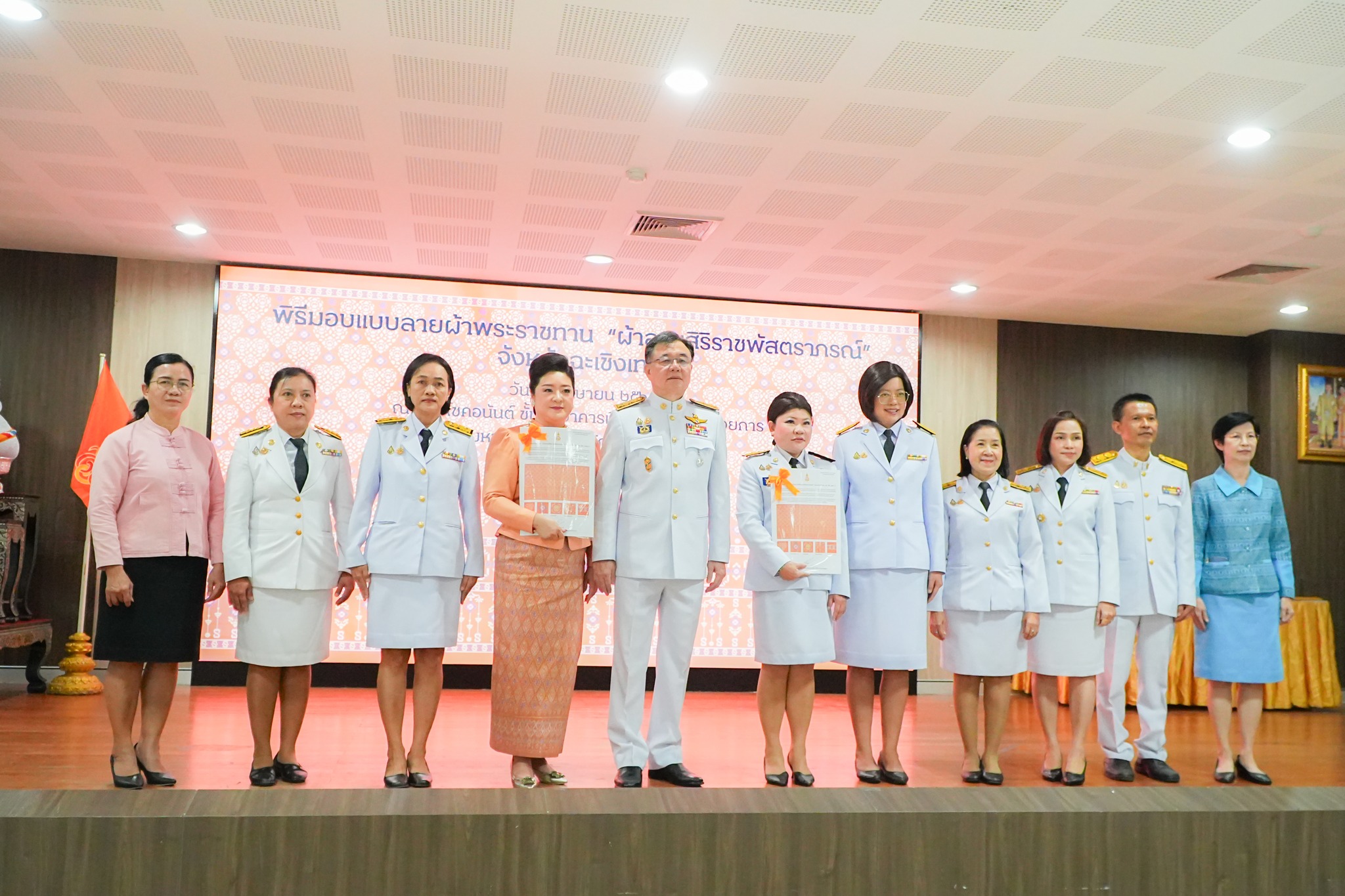 สำนักงานเกษตรจังหวัดฉะเชิงเทรา โดยนายดนัย ปัญจพิทยากุล เกษตรจังหวัดฉะเชิงเทรา มอบหมายให้นางเนาวรัตน์ ทิพสุวรรณ์ หัวหน้ากลุ่มอารักขาพืช เข้าร่วมพิธีมอบแบบลายผ้าพระราชทาน “ผ้าลายสิริราชพัสตราภรณ์” เพื่อนำแบบลายผ้าพระราชทานไปเป็นต้นแบบ และพัฒนาต่อยอด เพิ่มมูลค่าให้กับผลิตภัณฑ์ผ้าพื้นถิ่น และงานหัตถกรรม ส่งเสริมอาชีพ และสร้างรายได้ให้กับประชาชนในชุมชน กลุ่มเป้าหมายที่เข้ารับมอบทั้งหมด จำนวน 51 คน โดยมีนายขจรเกียรติ รักพานิชมณี ผู้ว่าราชการจังหวัดฉะเชิงเทรา เป็นประธานพิธีมอบลายผ้าพระราชทานฯ ณ ห้องโชคอนันต์ ชั้น 2 อาคารเรียนรวมและอำนวยการ มหาวิทยาลัยราชภัฏราชนครินทร์ อำเภอเมืองฉะเชิงเทรา