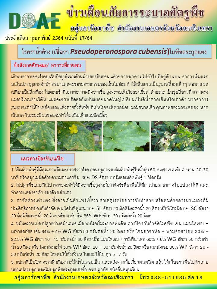 เกษตรแปดริ้ว เตือนภัยราน้ำค้างในพืชตระกูลแตง และหนอนเจาะลำต้นทุเรียน