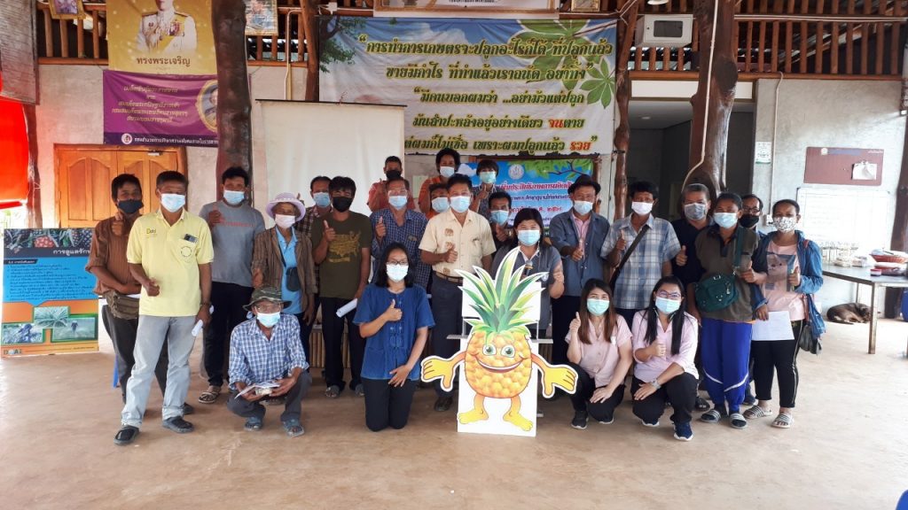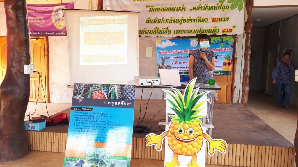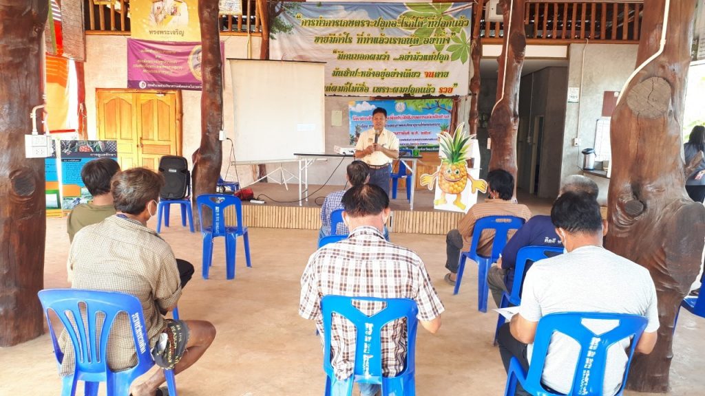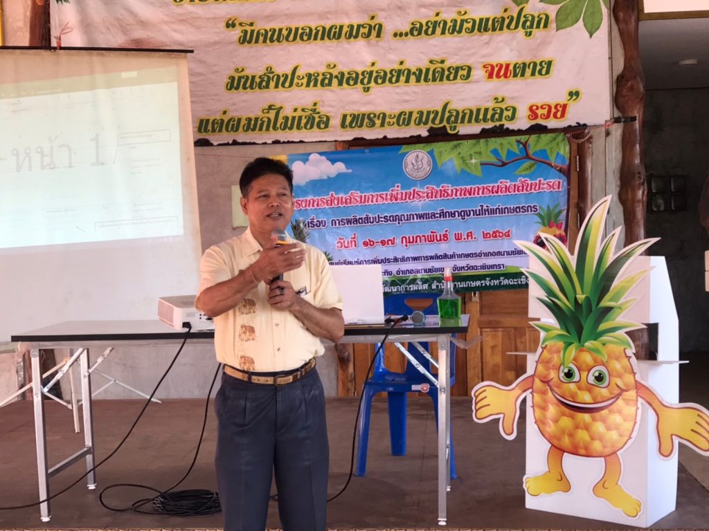 สำนักงานเกษตรจังหวัดฉะเชิงเทรา ร่วมกับสำนักงานเกษตรอำเภอสนามชัยเขต จัดกิจกรรมอบรมเกษตรกร เรื่อง การผลิตสับปะรดคุณภาพ รุ่นที่ 1 เป้าหมายเกษตรกร 25 ราย โดยเป็นเกษตรกรที่ปลูกสับปะรดตำบลลาดกระทิง อำเภอสนามชัยเขต จังหวัดฉะเชิงเทรา ณ ศพก. อำเภอสนามชัยเขต โดยได้รับเกียรติจาก ศวพ.ฉะเชิงเทรา (ศูนย์วิจัยและพัฒนาการเกษตรฉะเชิงเทรา ) มาถ่ายทอดความรู้ เรื่องการผลิตสับปะรดคุณภาพดีและการใช้ปุ๋ยเพื่อลดการตกค้างของสารไนเตรทในผลผลิตสับปะรดและนำเกษตรกรไปศึกษาดูงานแปลงเรียนรู้ต้นแบบการเพิ่มประสิทธิภาพสับปะรดคุณภาพ โดยใช้จุลินทรีย์ PGPR มาช่วยปรับปรุงบำรุงดิน ของ นายสมชาย สมาน ในพื้นที่ตำบลลาดกระทิง อำเภอสนามชัยเขต