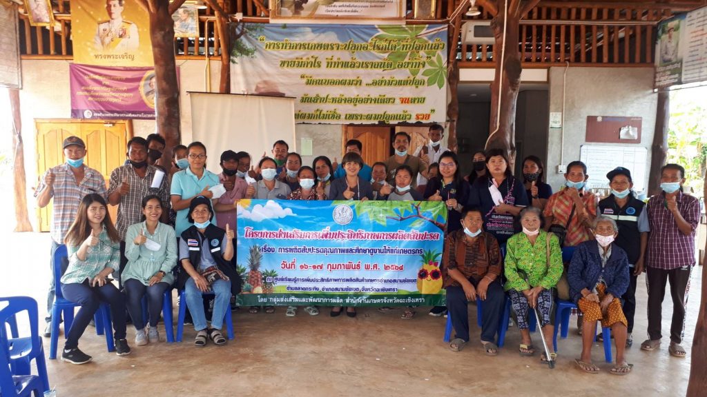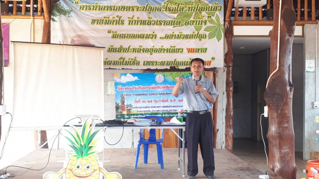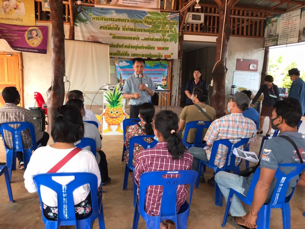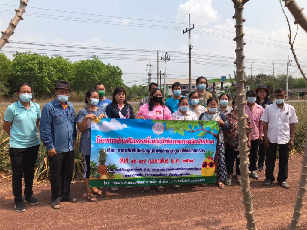 สำนักงานเกษตรจังหวัดฉะเชิงเทรา ร่วมกับสำนักงานเกษตรอำเภอสนามชัยเขต จัดกิจกรรมอบรมการผลิตสับปะรดคุณภาพ รุ่นที่ 2 ให้กับเกษตรกรเป้าหมาย ผู้ปลูกสับปะรด ในพื้นที่ตำบลคู้ยายหมี และตำบลท่ากระดาน อำเภอสนามชัยเขต จังหวัดฉะเชิงเทรา รวม 25 ราย โดยมีนายสาธิต เข็มกำเนิด เกษตรอำเภอสนามชัยเขต เป็นประธานเปิดการอบรม ณ ศพก. อำเภอสนามชัยเขต และได้รับการสนับสนุนวิทยากรจากศูนย์วิจัยและพัฒนาการเกษตรฉะเชิงเทรา ในการถ่ายทอดความรู้เรื่องการผลิตสับปะรดคุณภาพดีและการใช้ปุ๋ยเพื่อลดการตกค้างของสารไนเตรทในผลผลิตสับปะรด และนำเกษตรกรศึกษาดูงานแปลงเรียนรู้ต้นแบบการเพิ่มประสิทธิภาพสับปะรดคุณภาพ โดยใช้จุลินทรีย์ PGPR มาช่วยปรับปรุงบำรุงดิน ของนายสมชาย สมาน ประธาน ศพก.อำเภอสนามชัยเขต ในพื้นที่ตำบลลาดกระทิง อำเภอสนามชัยเขต