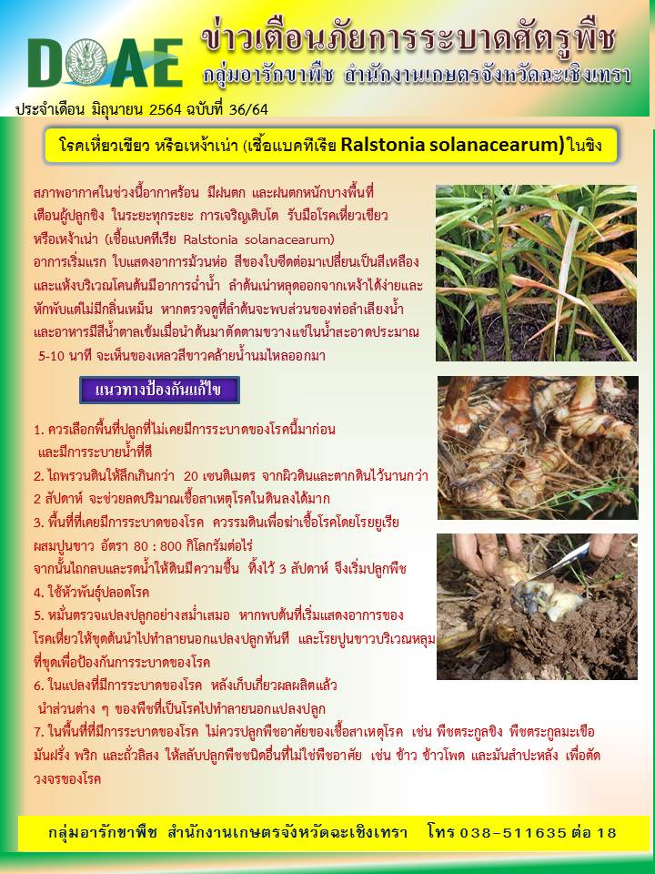 – โรคเหี่ยวเขียว หรือเหง้าเน่า (เชื้อแบคทีเรีย Ralstonia Solanacearum) ในขิง