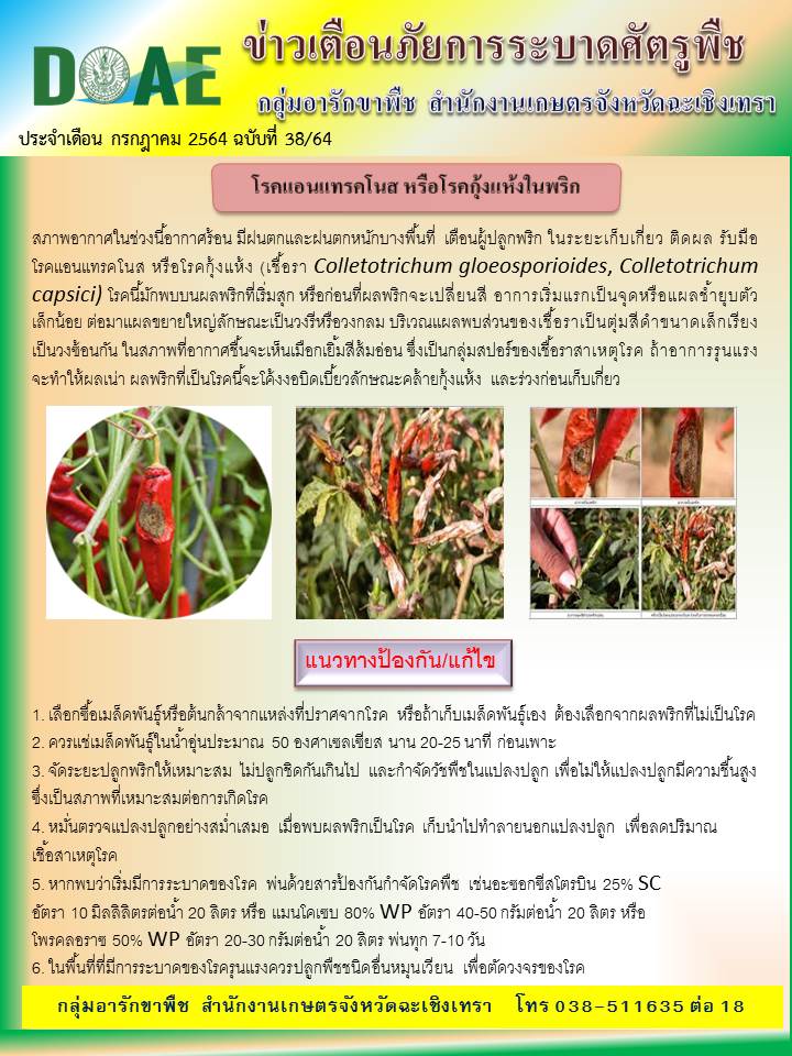เกษตรแปดริ้ว เตือน อากาศร้อน กับมีฝนตกและตกหนักมากในบางพื้นที่ ระวังการแพร่ระบาด – โรคแอนแทรคโนส หรือโรคกุ้งแห้งในพริก