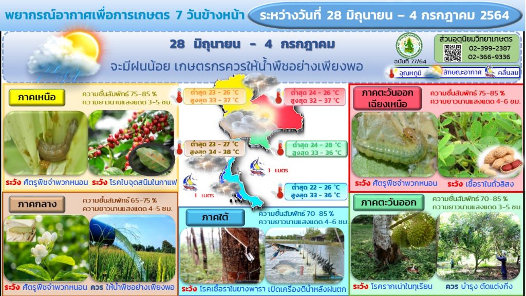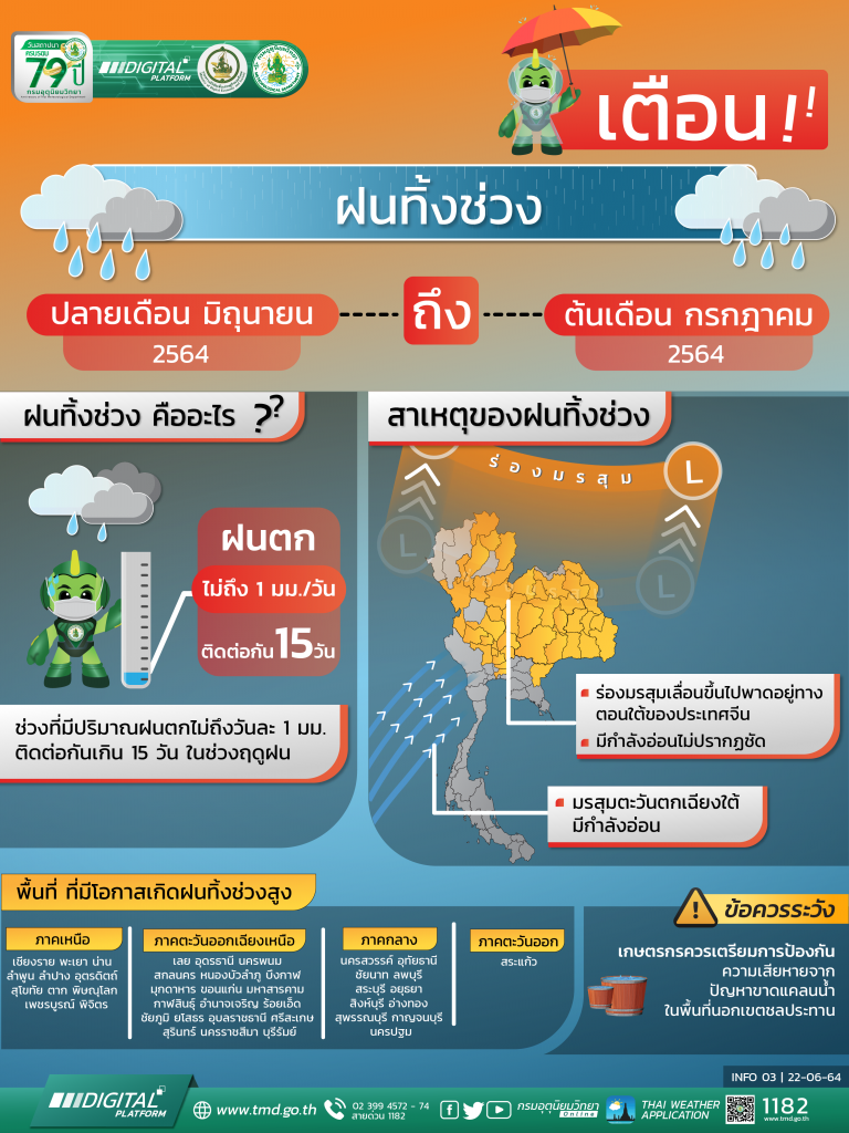 กรมอุตุนิยมวิทยาเตือน ภาวะฝนทิ้งช่วง ฝนทิ้งช่วง คือ ช่วงที่มีฝนตกไม่ถึงวันละ 1 มิลลิเมตร ติดต่อกันเกิน 15 วัน ซึ่งประเทศไทยมีโอกาสเกิดขึ้นได้สูงในช่วงเดือนมิถุนายน – กรกฎาคม กรมอุตุนิยมวิทยาแนะนำให้เกษตรกร – ติดตามข่าวจากกรมอุตุนิยมวิทยาอย่างใกล้ชิด – วางแผนการใช้น้ำ – เลือกระบบการให้น้ำที่มีประสิทธิภาพ