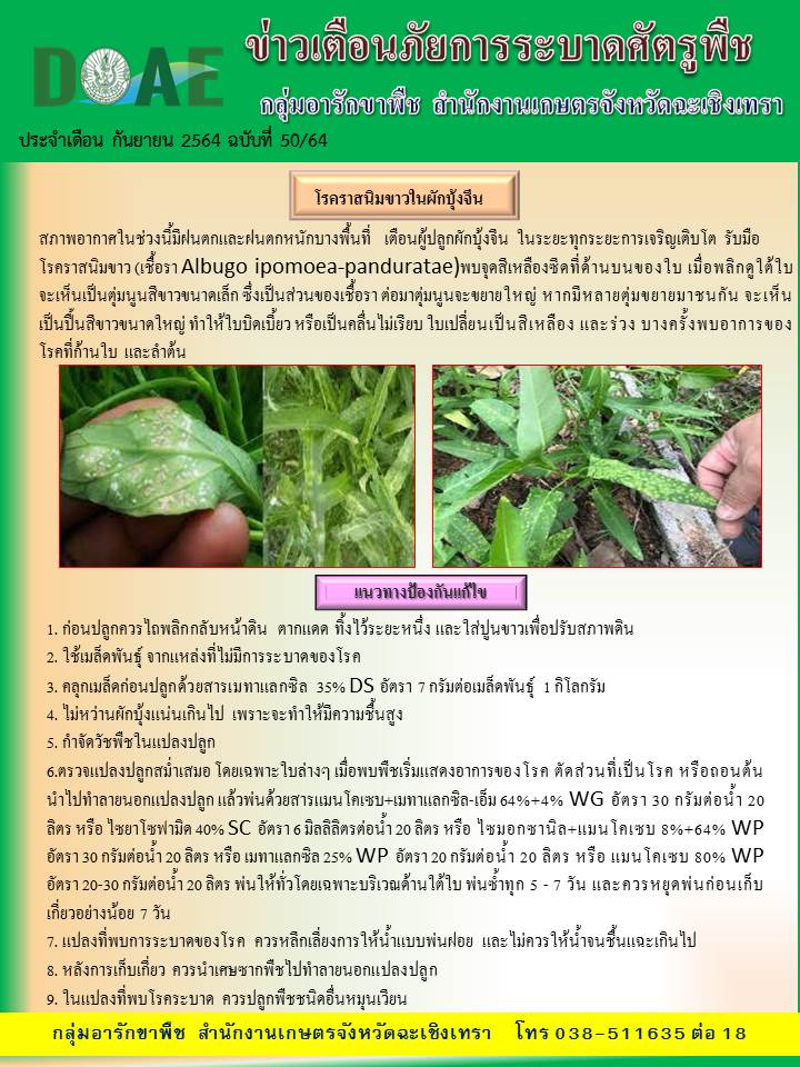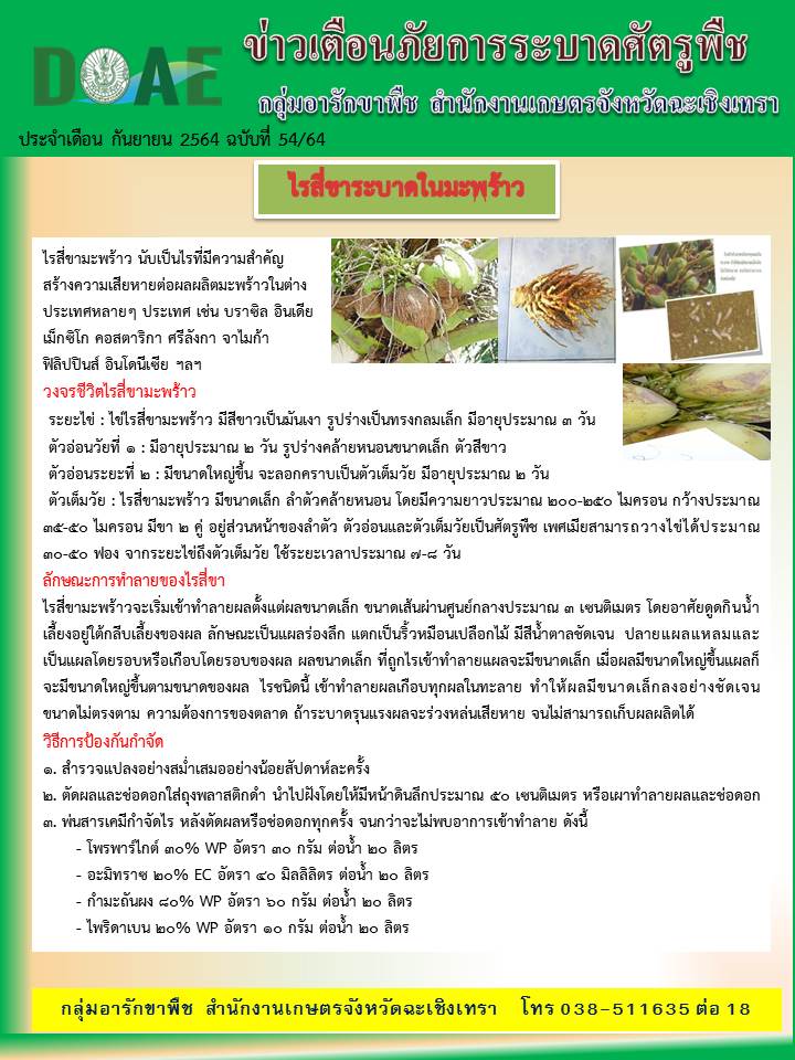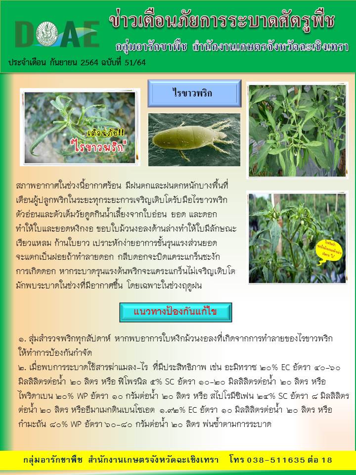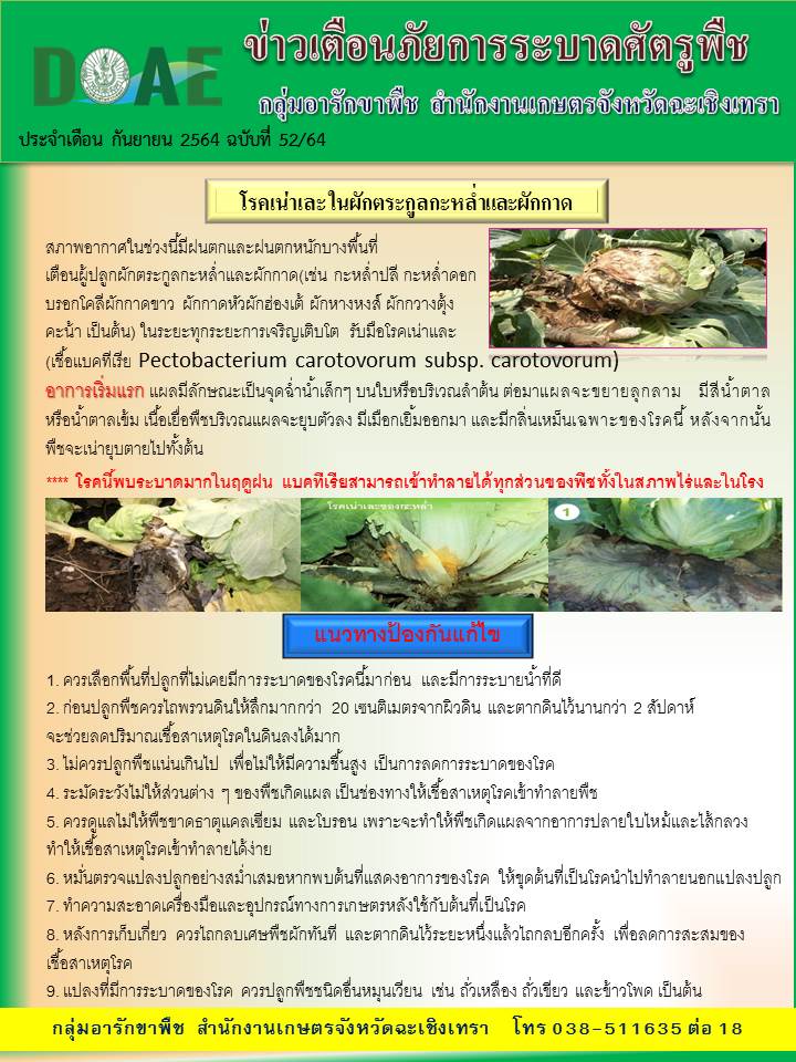 สภาพอากาศในช่วงนี้มีฝนตกและฝนตกหนักในบางพื้นที่ สำนักงานเกษตรจังหวัดฉะเชิงเทรา เตือนภัยโรคเน่าในพืชตระกูลกะหล่ำและผักกาด โรค โรคราสนิมในผักบุ้งจีน และไรขาวในพริก นอกจากนี้ยังพบการระบาดของไรสี่ขามะพร้าวที่สร้างความเสียหายให้แก่ผลผลิตมะพร้าวอีกด้วย