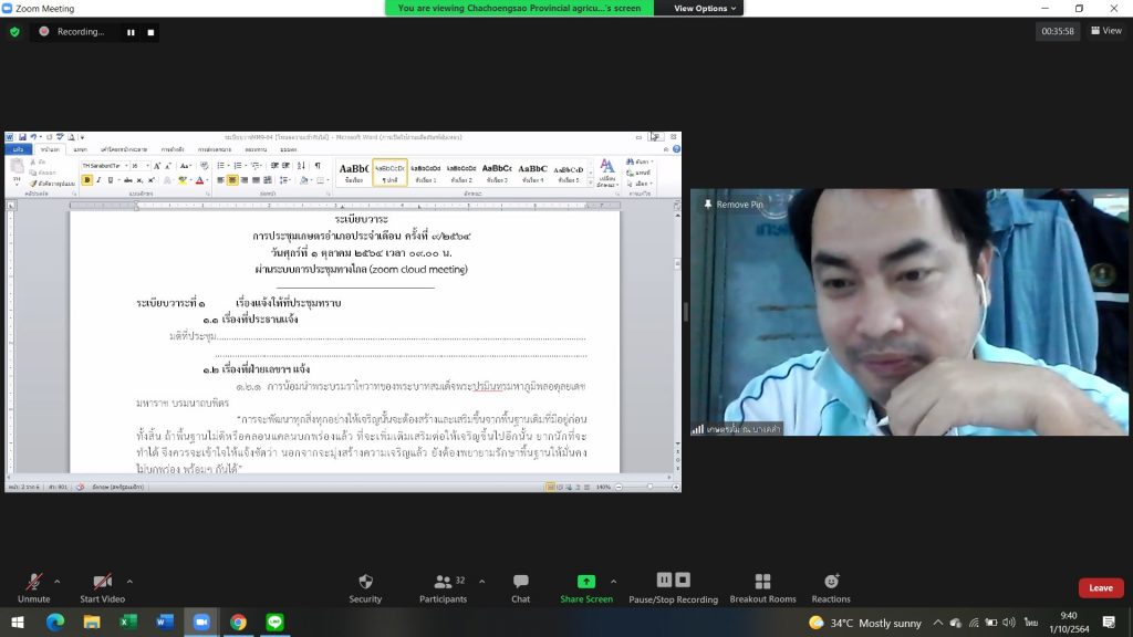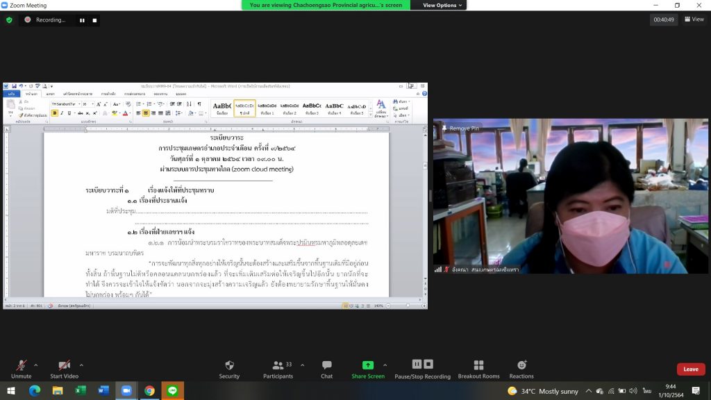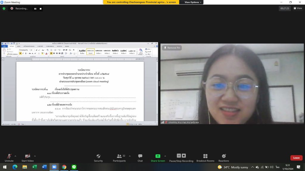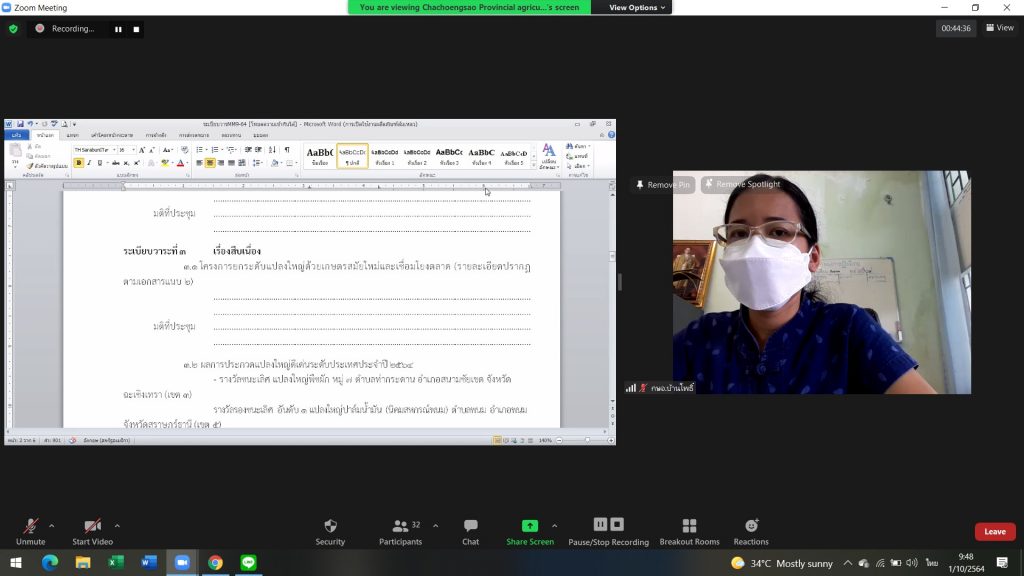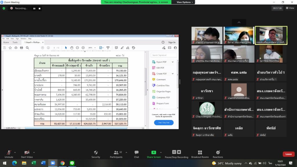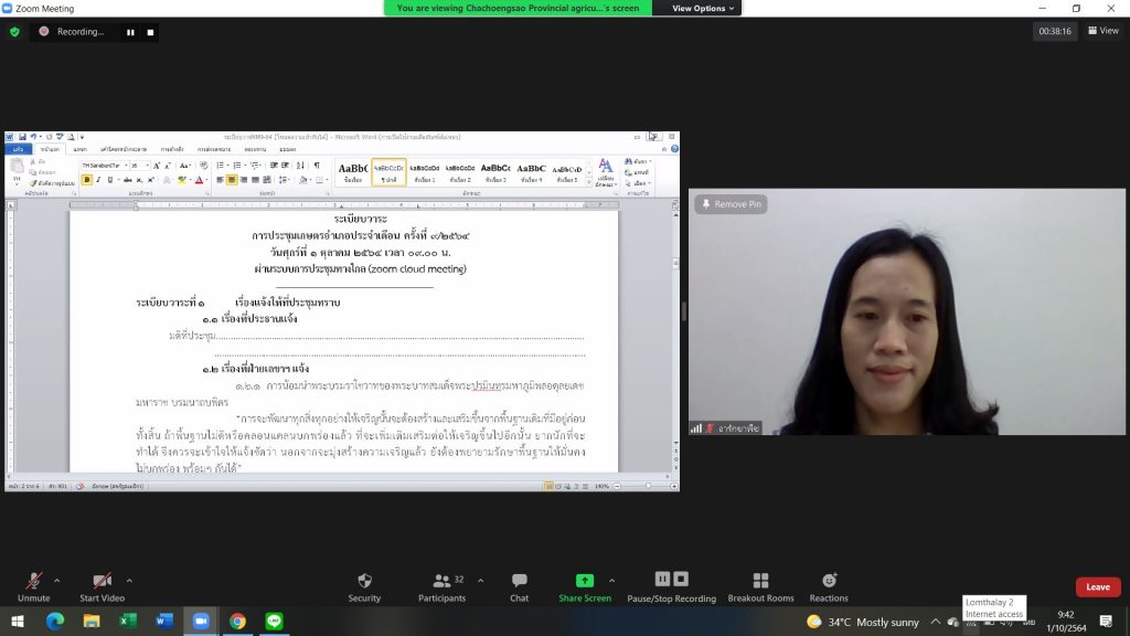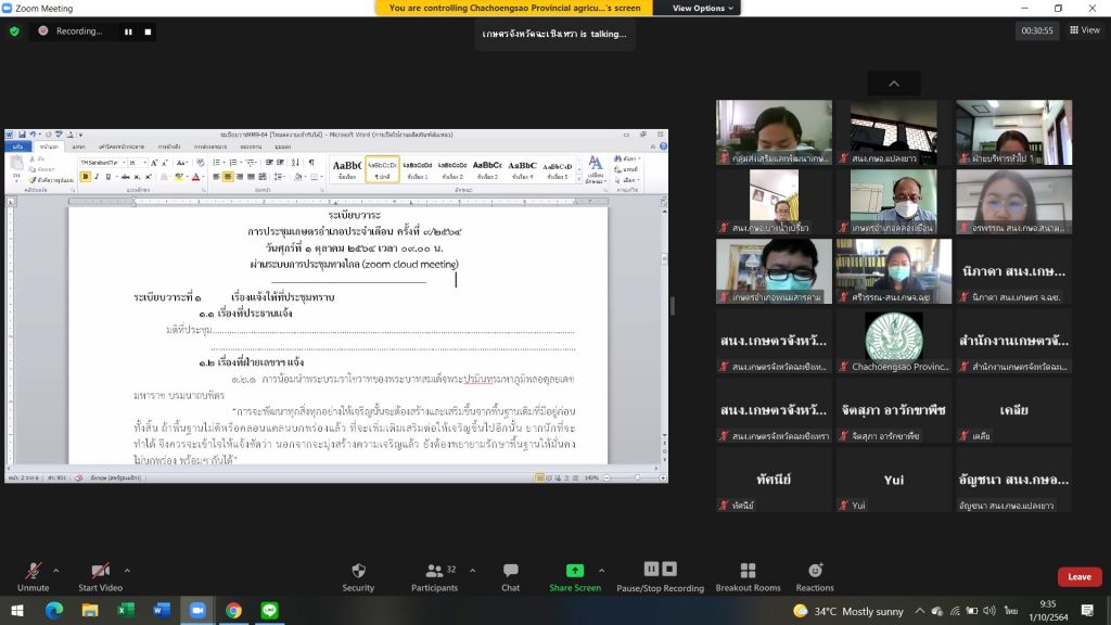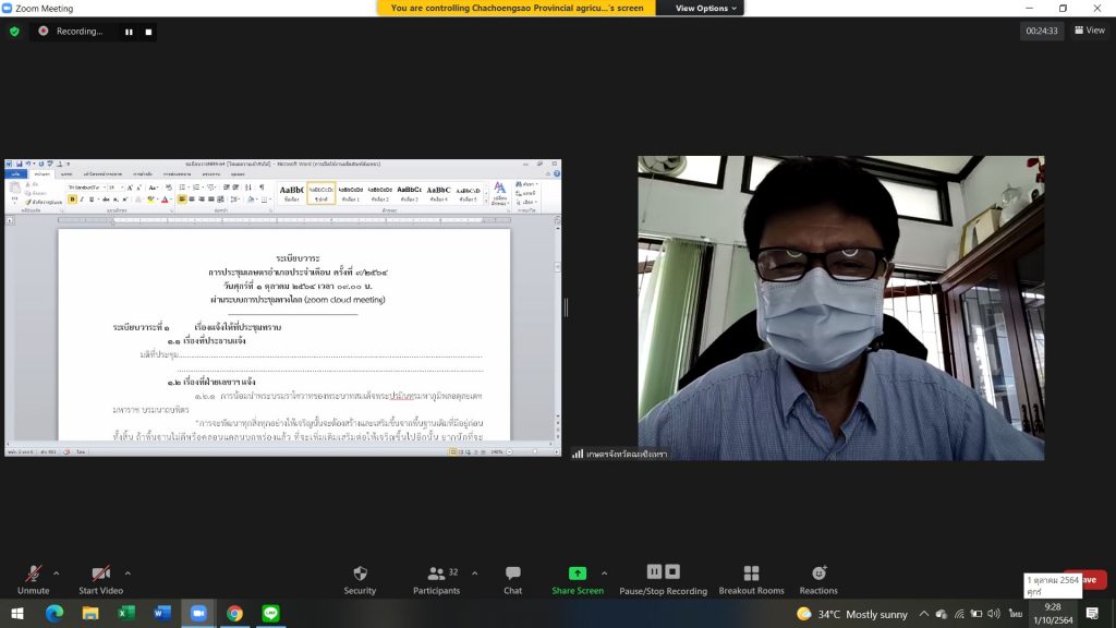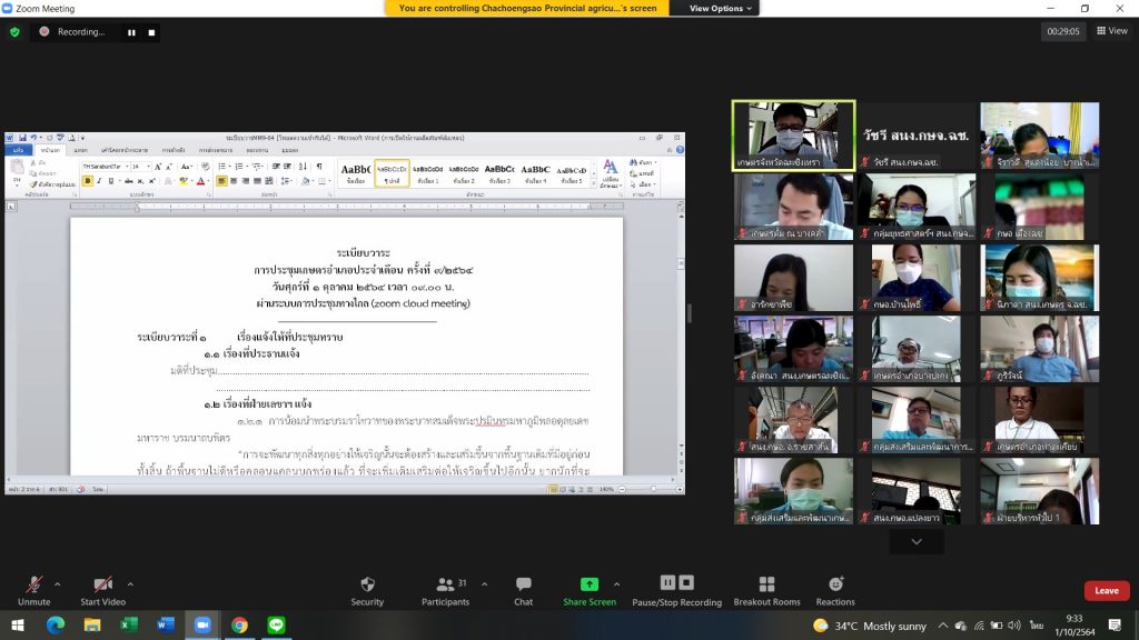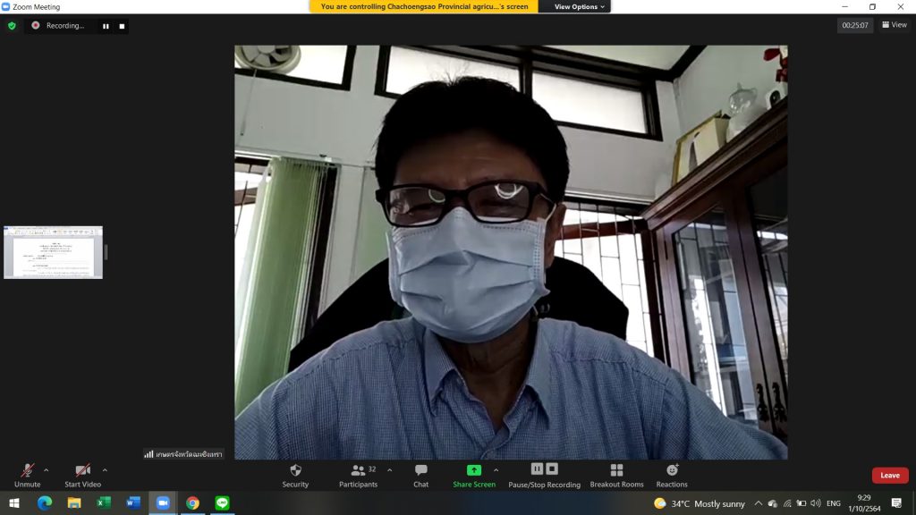 สำนักงานเกษตรจังหวัดฉะเชิงเทรา จัดประชุมเกษตรอำเภอประจำเดือน ครั้งที่ 9/2564 ผ่านระบบการประชุมทางไกล (Zoom cloud meeting) โดยมีนายดนัย ปัญจพิทยากุล เกษตรจังหวัดฉะเชิงเทรา เป็นประธาน พร้อมด้วยหัวหน้ากลุ่ม/ฝ่าย เกษตรอำเภอ และผู้แทนศูนย์ส่งเสริมและพัฒนาอาชีพการเกษตรจังหวัดฉะเชิงเทรา เข้าร่วมการประชุม เพื่อสรุปผลการดำเนินงานของสำนักงานเกษตรจังหวัดฉะเชิงเทรา และสำนักงานเกษตรอำเภอ ในปีงบประมาณ 2564 ที่ผ่านมา พร้อมร่วมกำหนดแนวทางการดำเนินงานส่งเสริมการเกษตรในปีงบประมาณ 2565 ให้เกิดความเข้าใจร่วมกัน สามารถนำไปปฏิบัติงานได้อย่างมีประสิทธิภาพ เป็นไปตามระเบียบของทางราชการ เกิดการบูรณาการร่วมกับหน่วยงานที่เกี่ยวข้อง และส่งผลให้เกิดประโยชน์สูงสุดแก่เกษตรกรในพื้นที่ ต่อไป