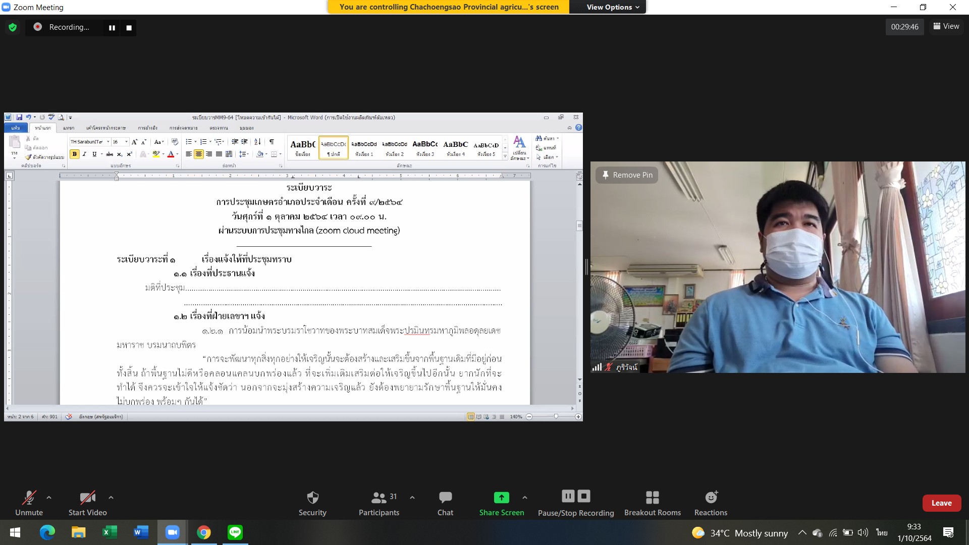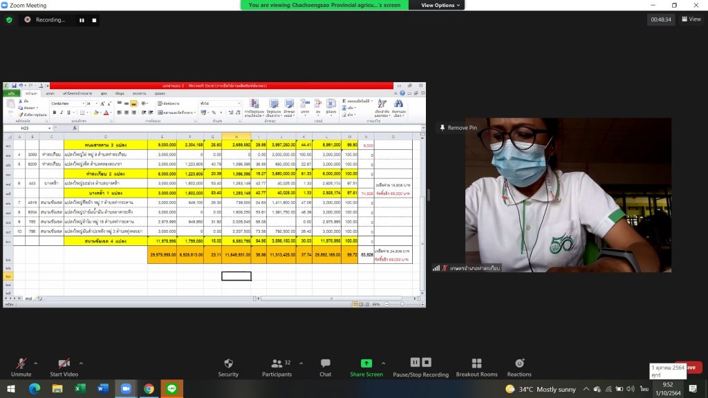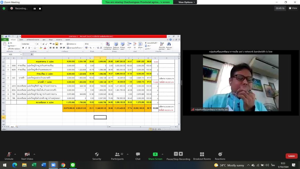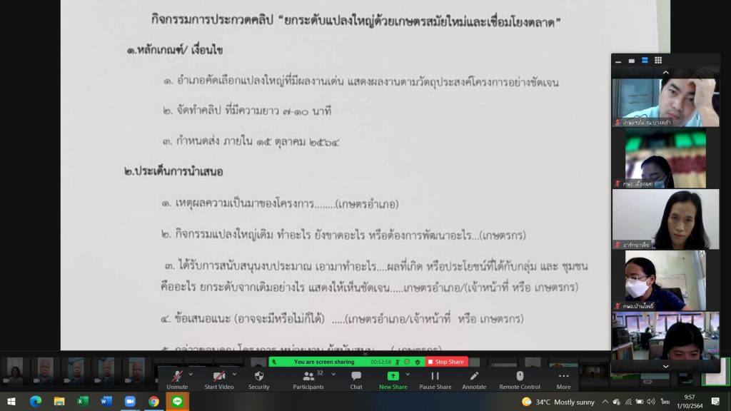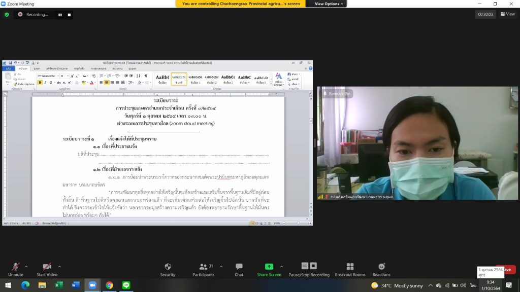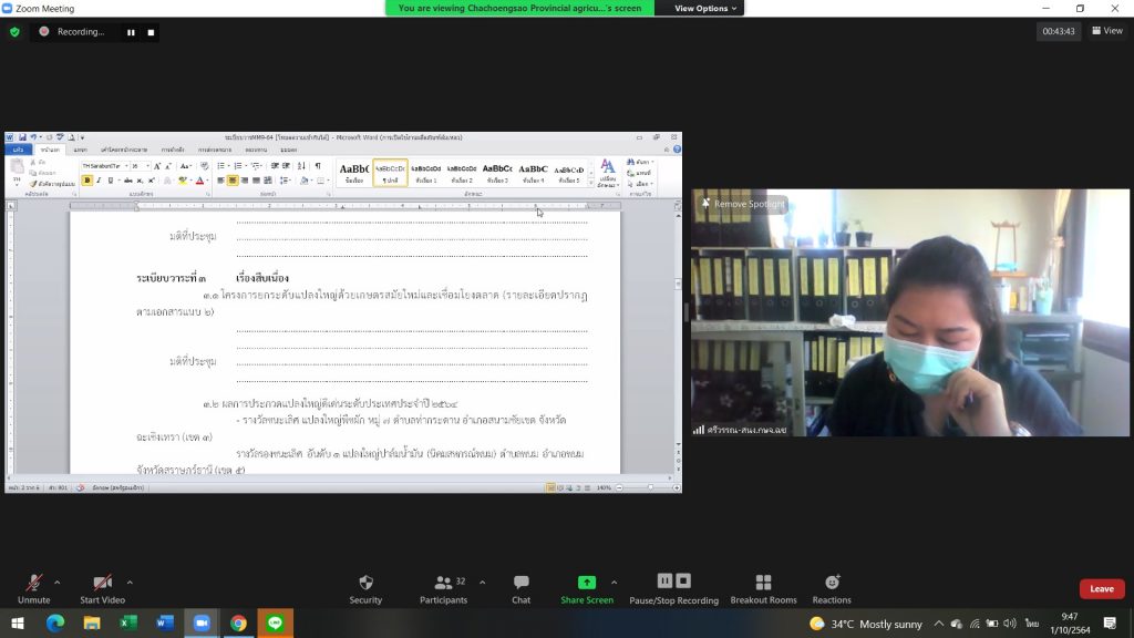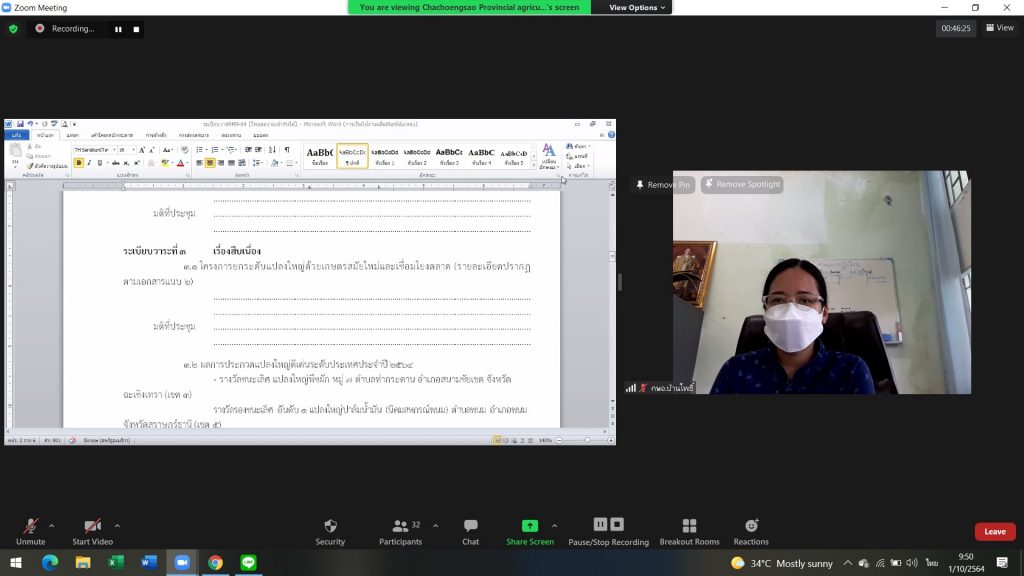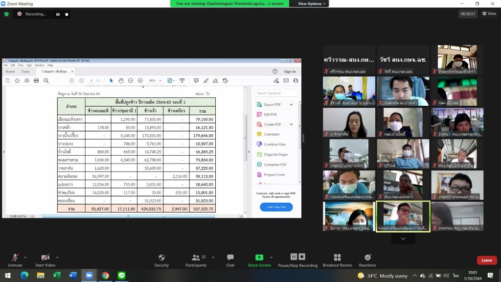 สำนักงานเกษตรจังหวัดฉะเชิงเทรา จัดประชุมเกษตรอำเภอประจำเดือน ครั้งที่ 9/2564 ผ่านระบบการประชุมทางไกล (Zoom cloud meeting) โดยมีนายดนัย ปัญจพิทยากุล เกษตรจังหวัดฉะเชิงเทรา เป็นประธาน พร้อมด้วยหัวหน้ากลุ่ม/ฝ่าย เกษตรอำเภอ และผู้แทนศูนย์ส่งเสริมและพัฒนาอาชีพการเกษตรจังหวัดฉะเชิงเทรา เข้าร่วมการประชุม เพื่อสรุปผลการดำเนินงานของสำนักงานเกษตรจังหวัดฉะเชิงเทรา และสำนักงานเกษตรอำเภอ ในปีงบประมาณ 2564 ที่ผ่านมา พร้อมร่วมกำหนดแนวทางการดำเนินงานส่งเสริมการเกษตรในปีงบประมาณ 2565 ให้เกิดความเข้าใจร่วมกัน สามารถนำไปปฏิบัติงานได้อย่างมีประสิทธิภาพ เป็นไปตามระเบียบของทางราชการ เกิดการบูรณาการร่วมกับหน่วยงานที่เกี่ยวข้อง และส่งผลให้เกิดประโยชน์สูงสุดแก่เกษตรกรในพื้นที่ ต่อไป
