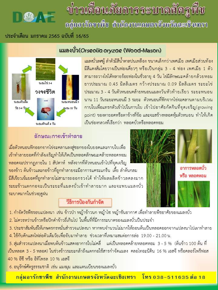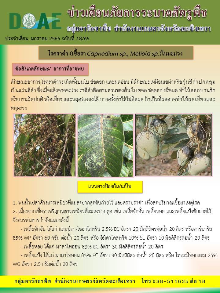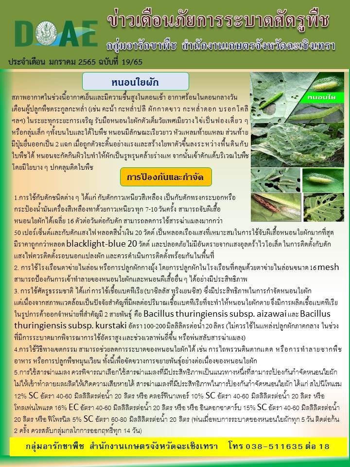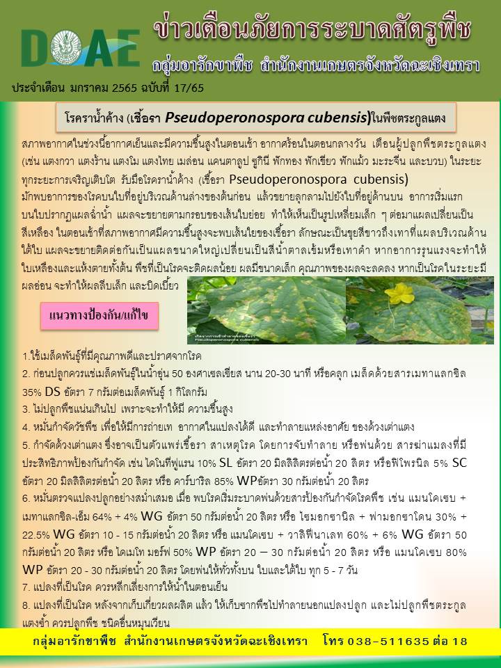 ช่วงอากาศเย็น ความชื้นสูงในตอนเช้า และมีอากาศร้อนในตอนกลางวัน เกษตรแปดริ้วเตือน ระวัง โรคราน้ำค้างในพืชตระกูลแตงโรคราดำในมะม่วงแมลงบั่วหนอนใยผัก