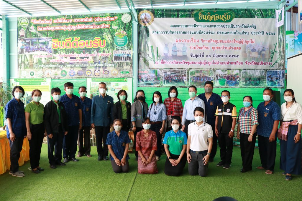 เกษตรแปดริ้ว รับการพิจารณาและตรวจประเมินรางวัลเลิศรัฐ สาขาการบริหารราชการแบบมีส่วนร่วม ประเภทร่วมใจแก้จน (Collaboration towards Poverty Eradication) ประจำปี 2565 สำนักงานเกษตรจังหวัดฉะเชิงเทรา นำโดยนายดนัย ปัญจพิทยากุล เกษตรจังหวัดฉะเชิงเทรา พร้อมด้วยนางสาวอาภาภรณ์ ชูเกียรติศิริ หัวหน้ากลุ่มยุทธศาสตร์และสารสนเทศ และเจ้าหน้าที่สำนักงานเกษตรจังหวัดฉะเชิงเทรา ร่วมกับสำนักงานเกษตรอำเภอท่าตะเกียบ รับการพิจารณา และตรวจประเมินรางวัลเลิศรัฐ สาขาการบริหารราชการแบบมีส่วนร่วม ประเภทร่วมใจแก้จน (Collaboration towards Poverty Eradication) ประจำปี 2565 โดยได้รับเกียรติจากนางสาวอรพินธ์ สพโชคชัย อนุกรรมการพัฒนาระบบราชการ (อ.ก.พ.ร.) และคณะดำเนินการพิจารณาและตรวจประเมินฯ ได้รับเกียรติจากนายณัฐพงษ์ สงวนจิตร รองผู้ว่าราชการจังหวัดฉะเชิงเทรา กล่าวต้อนรับ และนางอัญชลี สุวจิตรานน์ รองอธิบดีกรมส่งเสริมการเกษตร กล่าวรายงาน พร้อมด้วยผู้แทนหน่วยงานบูรณาการทั้งภาครัฐ ภาคเอกชน และภาคการศึกษา ร่วมให้ข้อมูลสนับสนุนการดำเนินงาน ณ ที่ทำการกลุ่มแปลงใหญ่ไผ่อำเภอท่าตะเกียบ เพื่อนำเสนอข้อมูลกระบวนการดำเนินงานที่ช่วยส่งเสริมและพัฒนาให้เกษตรกรมีคุณภาพชีวิต ความเป็นอยู่ที่ดีขึ้น เป็นแนวทางต้นแบบในการพัฒนาพร้อมแลกเปลี่ยนรับข้อเสนอแนะ จากคณะพิจารณาและตรวจประเมินฯ ในการพัฒนากลุ่มให้มีความเข้มแข็ง ต่อยอดธุรกิจให้ประสบความสำเร็จ และสามารถสร้างรายได้ให้แก่ชุมชนได้อย่างยั่งยืน