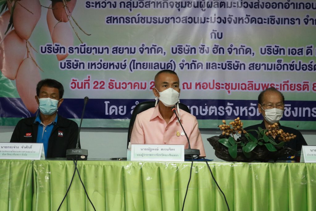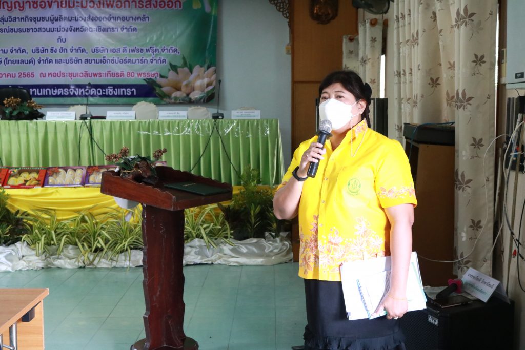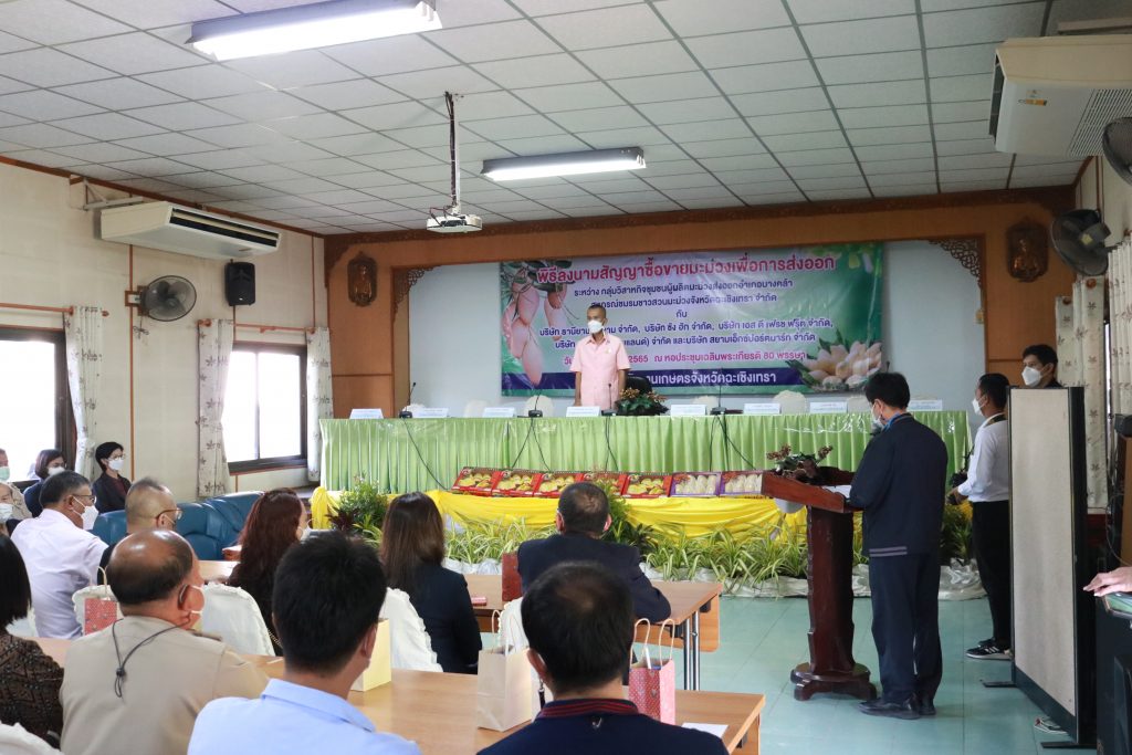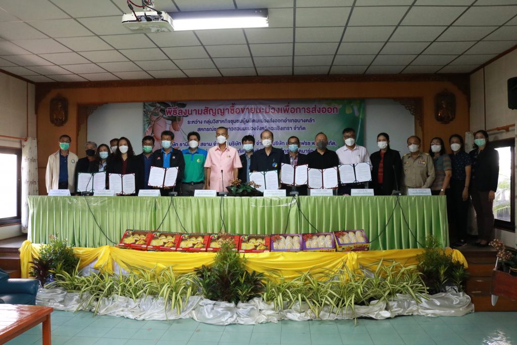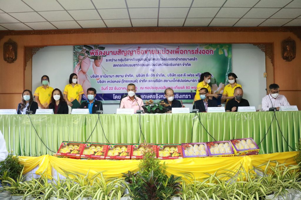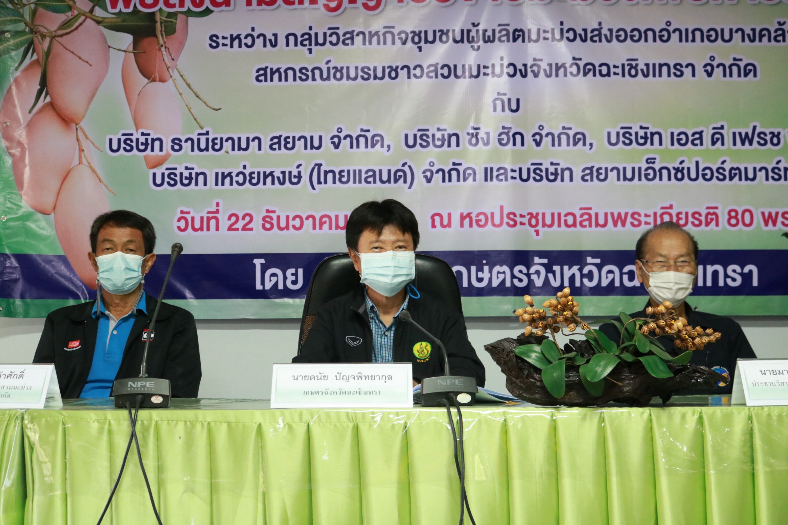 สำนักงานเกษตรจังหวัดฉะเชิงเทรา นำโดยนายดนัย ปัญจพิทยากุล เกษตรจังหวัดฉะเชิงเทรา พร้อมด้วยเจ้าหน้าที่สำนักงานเกษตรจังหวัดฉะเชิงเทรา จัดพิธีลงนามสัญญาซื้อขายมะม่วงเพื่อการส่งออก โดยมีนายณัฐพงษ์ สงวนจิตร รองผู้ว่าราชการจังหวัดฉะเชิงเทรา เป็นประธานในพิธีเปิดงาน พร้อมด้วยหัวหน้าส่วนราชการในสังกัดกระทรวงเกษตรและสหกรณ์ พาณิชย์จังหวัดฉะเชิงเทรา ประชาสัมพันธ์จังหวัดฉะเชิงเทรา หัวหน้ากลุ่มงานสำนักงานเกษตรจังหวัดฉะเชิงเทรา เกษตรอำเภอ และเกษตรกรผู้ผลิตมะม่วงของจังหวัดฉะเชิงเทรา จำนวน 70 ราย ร่วมเป็นสักขีพยานในพิธีลงนามสัญญาซื้อขายมะม่วงระหว่างกลุ่มวิสาหกิจชุมชนผู้ผลิตมะม่วงส่งออกอำเภอบางคล้า และสหกรณ์ชมรมชาวสวนมะม่วงจังหวัดฉะเชิงเทรา จำกัด กับบริษัทผู้ส่งออก 5 บริษัท ณ หอประชุมเฉลิมพระเกียรติ 80 พรรษา สำนักงานเกษตรจังหวัดฉะเชิงเทรา รวมผลผลิต 900 ตัน คิดเป็นมูลค่ากว่า 55 ล้านบาท พร้อมทั้งจัดกิจกรรมสัมมนาเครือข่ายผู้ผลิตและผู้ส่งออกมะม่วงของจังหวัดฉะเชิงเทรา เพื่อสร้างความเข้าใจในการผลิตมะม่วงของเกษตรกรให้สอดคล้องกับความต้องการของตลาด และสร้างความมั่นใจแก่เกษตรกรผู้ผลิตด้านตลาดรับซื้อที่แน่นอน
