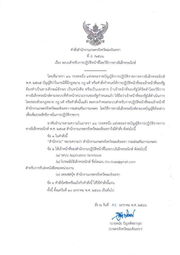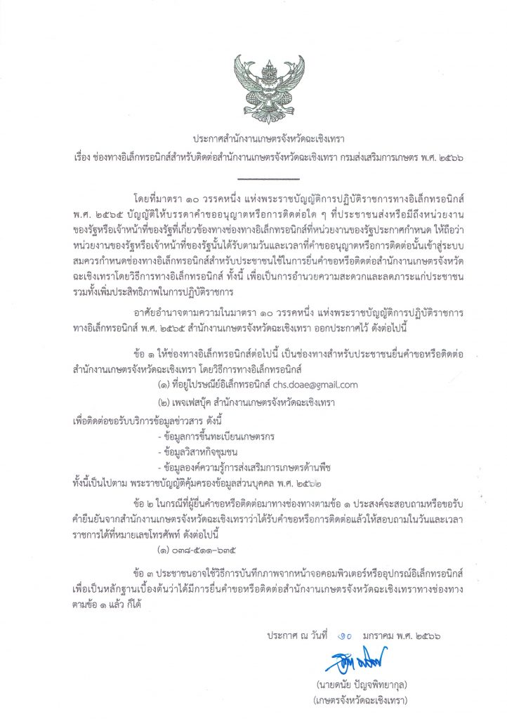 สำนักงานเกษตรจังหวัดฉะเชิงเทรา ขอแจ้ง1) คำสั่งสำนักงานเกษตรจังหวัดฉะเชิงเทรา ที่ 1/2566 เรื่อง ระบบสำหรับการปฏิบัติหน้าที่โดยวิธีการทางอิเล็กทรอนิกส์ 2) ประกาศสำนักงานเกษตรจังหวัดฉะเชิงเทรา เรื่อง ช่องทางอิเล็กทรอนิกส์สำหรับติดต่อสำนักงานเกษตรจังหวัดฉะเชิงเทรา กรมส่งเสริมการเกษตร พ.ศ. 2566
