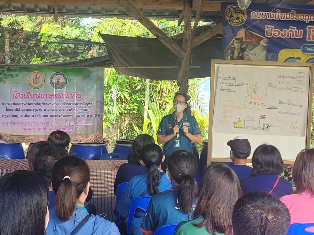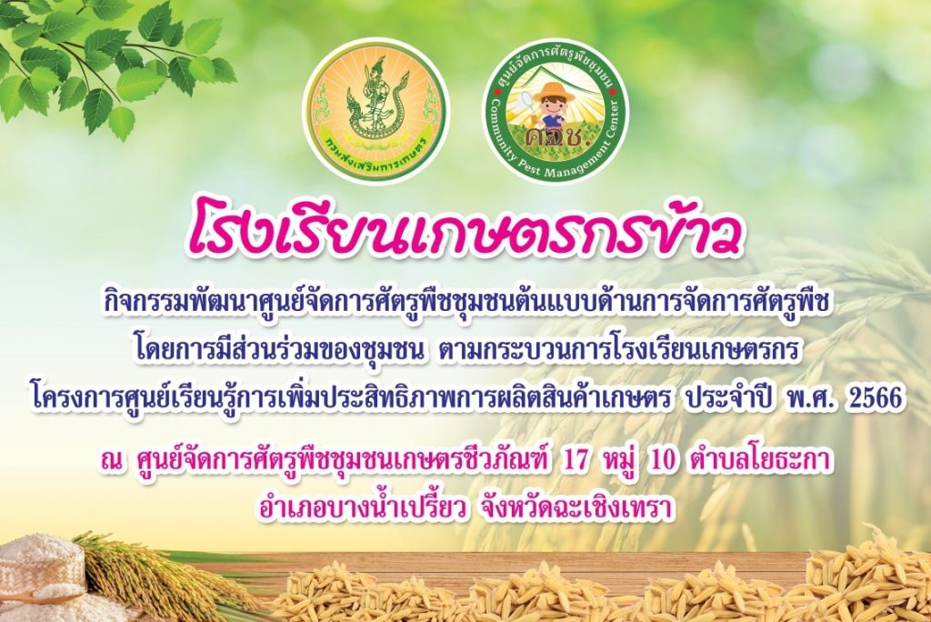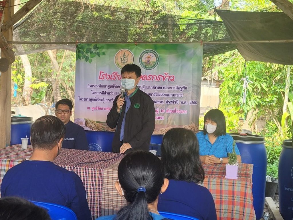 สำนักงานเกษตรจังหวัดฉะเชิงเทรา นำโดยนายดนัย ปัญจพิทยากุล เกษตรจังหวัดฉะเชิงเทรา มอบหมายให้นางวิภา จิระวัฒน์ หัวหน้ากลุ่มอารักขาพืช พร้อมด้วยเจ้าหน้าที่สำนักงานเกษตรจังหวัดฉะเชิงเทรา ร่วมกับเจ้าหน้าที่สำนักงานเกษตรอำเภอบางน้ำเปรี้ยว และเจ้าหน้าที่ผู้รับผิดชอบงานอารักขาพืช 11 อำเภอของจังหวัดฉะเชิงเทรา จัดกิจกรรมพัฒนาศูนย์จัดการศัตรูพืชชุมชนต้นแบบด้านการจัดการศัตรูพืชโดยการมีส่วนร่วมของชุมชน ตามกระบวนการโรงเรียนเกษตรกร ครั้งที่ 1 โครงการศูนย์เรียนรู้การเพิ่มประสิทธิภาพการผลิตสินค้าเกษตร ประจำปีงบประมาณ พ.ศ. 2566 เกษตรกรเป้าหมายได้แก่ สมาชิกกลุ่มเกษตรชีวภัณฑ์ 17 หมู่ 10 ตำบลโยธะกา จำนวน 15 ราย โดยการจัดกิจกรรมในครั้งนี้มีวัตถุประสงค์เพื่อให้เกิดการแลกเปลี่ยนเรียนรู้ และพัฒนาทักษะด้านการอารักขาพืชของสมาชิก ศจช. ผ่านการเรียนเรียนรู้และปฏิบัติตามกระบวนการโรงเรียนเกษตรกร และเพื่อพัฒนา ศจช. ให้เป็นโรงเรียนเกษตรกรต้นแบบด้านการจัดการศัตรูพืช สำหรับขยายผลกระบวนการโรงเรียนเกษตรกรสู่ ศจช. อื่น ๆ ต่อไป โดยมีนายธีรพล อุทัยพันธ์ นายกองค์การบริหารส่วนตำบลโยธะกา กล่าวต้อนรับ และนาย ดนัย ปัญจพิทยากุล เกษตรจังหวัดฉะเชิงเทรา กล่าวเปิดกิจกรรมในครั้งนี้ ณ ที่ทำการกลุ่มเกษตรชีวภัณฑ์ 17 หมู่ 10 ตำบลโยธะกา อำเภอบางน้ำเปรี้ยว จังหวัดฉะเชิงเทรา