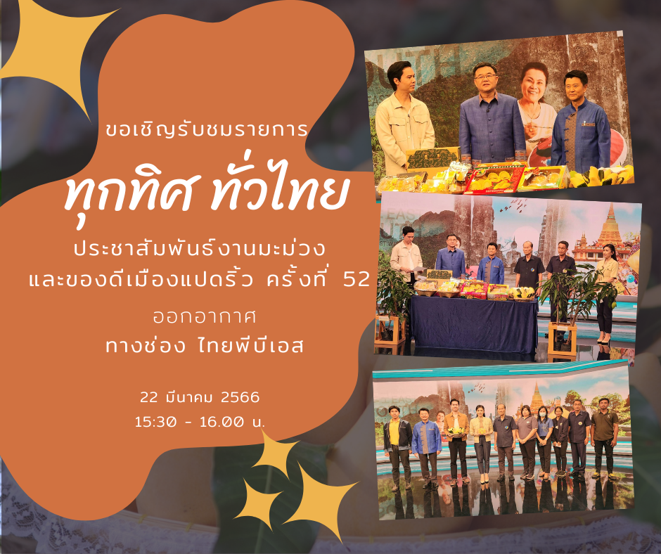 จังหวัดฉะเชิงเทรา นำโดยนายขจรเกียรติ รักพานิชมณี ผู้ว่าราชการจังหวัดฉะเชิงเทรา พร้อมด้วยนายดนัย ปัญจพิทยากุล เกษตรจังหวัดฉะเชิงเทรา นายมานพ แก้ววงษ์นุกูล ประธานวิสาหกิจชุมชนผู้ผลิตมะม่วงส่งออกอำเภอบางคล้า จังหวัดฉะเชิงเทรา และนายกระจ่าง จำศักดิ์ ประธานสหกรณ์ชมรมชาวสวนมะม่วงจังหวัดฉะเชิงเทรา จำกัด ร่วมให้ข้อมูลสถานการณ์การผลิต การตลาดมะม่วงจังหวัดฉะเชิงเทรา การผลิตมะม่วงตามมาตรฐานการปฏิบัติทางการเกษตรที่ดี และการพัฒนามะม่วงแปดริ้วเป็นสินค้าเกษตรอัตลักษณ์ พร้อมประชาสัมพันธ์การจัดงานวันมะม่วงและของดีเมืองแปดริ้ว ครั้งที่ 52 ในการบันทึกเทปรายการทุกทิศ ทั่วไทย โดยจะออกอากาศผ่านทางช่องไทยพีบีเอส ในวันที่ 22 มีนาคม 2566 เวลา 15.30 – 16.00 .น