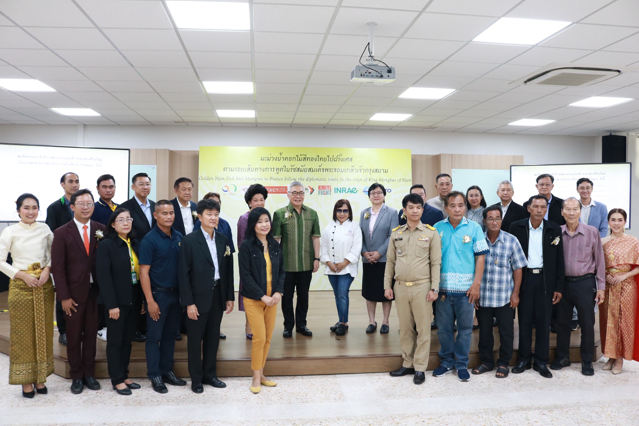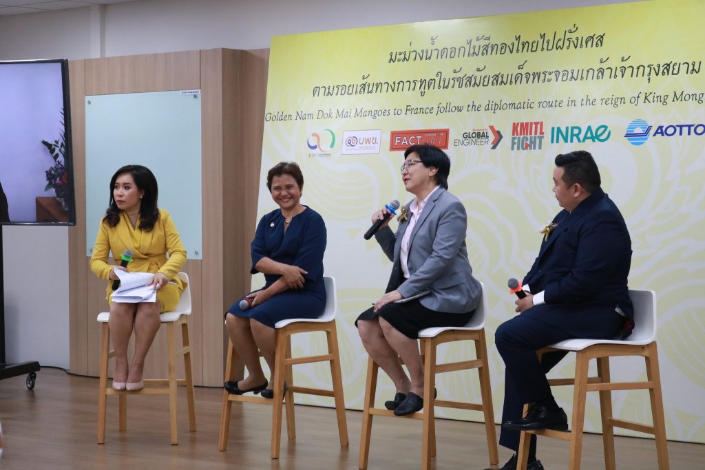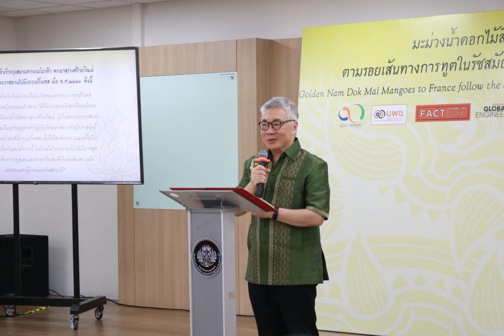 สถาบันเทคโนโลยีพระจอมเกล้าเจ้าคุณทหารลาดกระบัง จัดแถลงข่าว “มะม่วงน้ำดอกไม้สีทองไทยไปฝรั่งเศสตามรอยเส้นทางการทูตในรัชสมัยสมเด็จพระจอมเกล้าเจ้ากรุงสยาม” ณ ห้อง 704 ชั้น 7 (อาคาร 12 ชั้น) คณะวิศวกรรมศาสตร์ สถาบันเทคโนโลยีพระจอมเกล้าเจ้าคุณทหารลาดกระบัง ซึ่งคณะวิศวกรรมศาสตร์ สถาบันเทคโนโลยีพระจอมเกล้าเจ้าคุณทหารลาดกระบัง ร่วมกับ National Research Institute for Agriculture Food and Environment (INRAE) แห่งประเทศฝรั่งเศส และบริษัท ท่าอากาศยานไทย จำกัด (มหาชน) โดยการสนับสนุนของหน่วยบริหารและจัดการกองทุนด้านการเพิ่มความสามารถในการแข่งขันของประเทศ (บพข.) ทดสอบการขนส่งมะม่วงน้ำดอกไม้สีทองจากจังหวัดฉะเชิงเทราไปยังประเทศฝรั่งเศส ด้วยระบบจัดการโซ่ความเย็นสำหรับผลิตผลเกษตรเน่าเสียง่ายทางอากาศ (Cold Chain) เพื่อพัฒนาเป็นระบบต้นแบบสำหรับการส่งออกผลิตผลเกษตรเน่าเสียง่ายทางอากาศไปยังประเทศในยุโรป โดยนายดนัย ปัญจพิทยากุล เกษตรจังหวัดฉะเชิงเทรา ได้รับมอบหมายให้ร่วมเป็นเกียรติในการแถลงข่าวด้วย