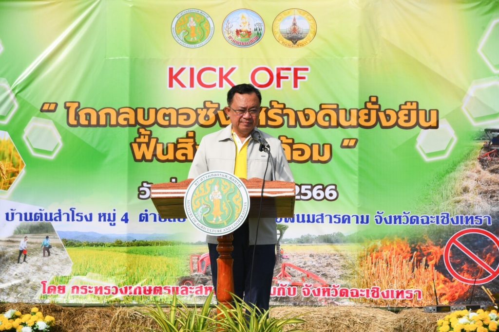 สำนักงานเกษตรจังหวัดฉะเชิงเทรา นำโดยนายดนัย ปัญจพิทยากุล เกษตรจังหวัดฉะเชิงเทรา เข้าร่วมงาน “ไถกลบต่อซัง สร้างดินยั่งยืน ฟื้นสิ่งแวดล้อม” ประจำปีงบประมาณ พ.ศ. 2567 บนพื้นที่เกษตรกรรมที่มีความเสี่ยงต่อการเผา (Hot Spot) โดยมีนายชลธี ยังตรง ผู้ว่าราชการจังหวัดฉะเชิงเทรา เป็นประธานในพิธีเปิดงาน ณ บ้านต้นสำโรง หมู่ที่ 4 ตำบลบ้านซ่อง อำเภอพนมสารคาม จังหวัดฉะเชิงเทรา โดยกระทรวงเกษตรและสหกรณ์กำหนด Kick Off กิจกรรมดังกล่าวในพื้นที่ 56 จังหวัด มีศูนย์กลางการจัดงาน ณ จังหวัดเชียงใหม่ โดยมีรัฐมนตรีว่าการกระทรวงเกษตรและสหกรณ์ เป็นประธานเปิดงาน และกำหนดพื้นที่ตัวแทนภาค 5 จังหวัด ได้แก่ ลพบุรี ฉะเชิงเทรา ขอนแก่น กาญจนบุรี และสุราษฎร์ธานี เพื่อเป็นการสื่อสาร ประชาสัมพันธ์ให้เกษตรกร และประชาชนรับทราบถึงการเตรียมความพร้อมในการแก้ไขปัญหา PM 2.5 ภาคการเกษตรในเชิงรุก ของกระทรวงเกษตรและสหกรณ์ พร้อมทั้งสร้างความตระหนักรู้ถึงผลกระทบที่เกิดจากการเผาวัสดุทางการเกษตร