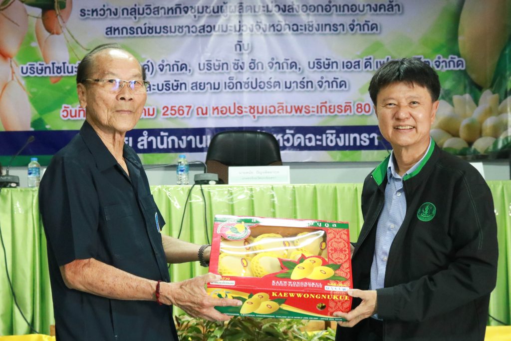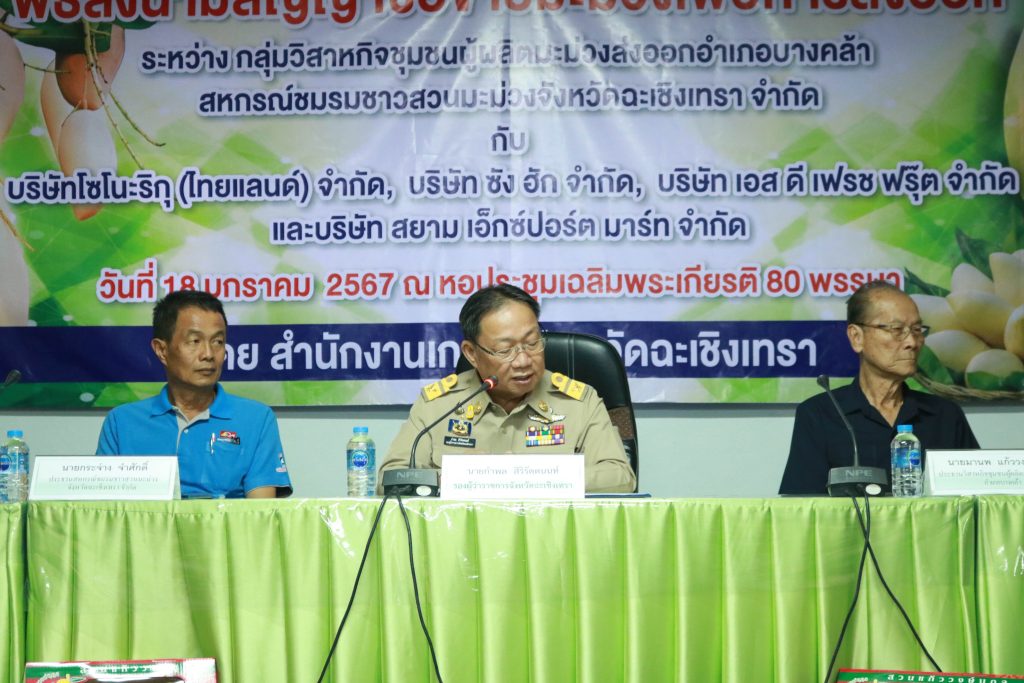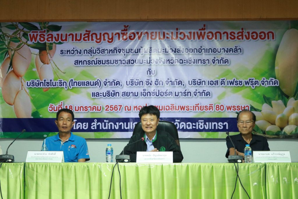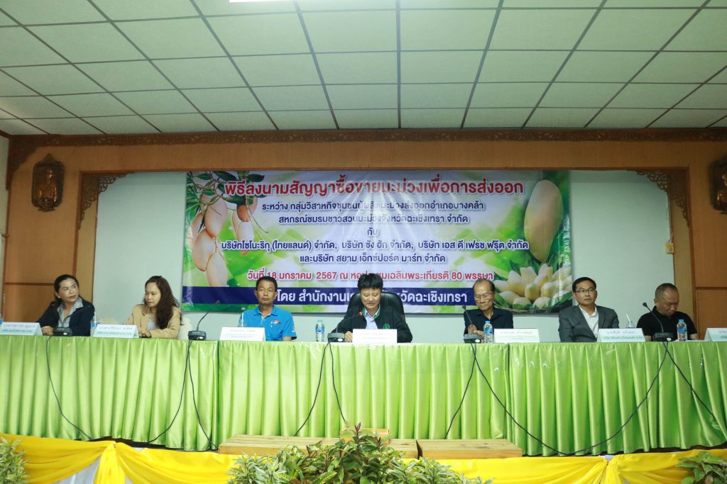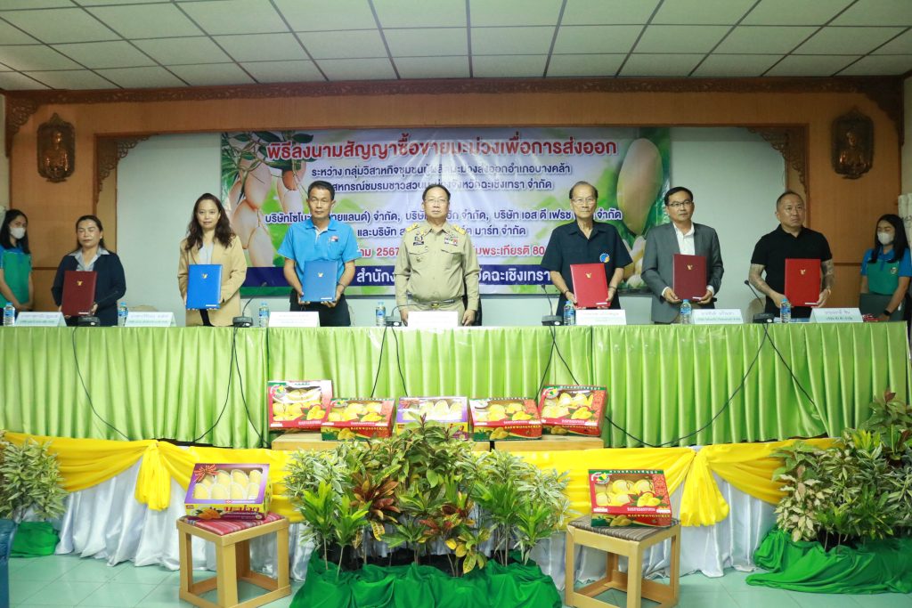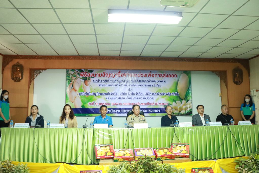 มะม่วงเป็นผลผลิตที่มีชื่อเสียงของจังหวัดฉะเชิงเทรา ซึ่งมีพื้นที่ปลูกกว่า 21,300 ไร่ ในเดือนมกราคม – พฤษภาคม เป็นช่วงที่ผลผลิตมะม่วงนอกฤดูและผลผลิตมะม่วงในฤดูของจังหวัดฉะเชิงเทราออกสู่ตลาด จังหวัดฉะเชิงเทรา จึงจัดพิธีลงนามสัญญาซื้อขายมะม่วงเพื่อการส่งออก ณ หอประชุมเฉลิมพระเกียรติ 80 พรรษา สำนักงานเกษตรจังหวัดฉะเชิงเทรา ซึ่งจัดให้เครือข่ายผู้ผลิตและผู้ส่งออกมะม่วงของจังหวัดฉะเชิงเทราลงนามสัญญาซื้อขายผลผลิต กิจกรรมประกอบด้วยการลงนามสัญญาซื้อขายผลผลิตมะม่วงระหว่างวิสาหกิจชุมชนผู้ผลิตมะม่วงส่งออกอำเภอบางคล้า กับบริษัท โซโนะริกุ (ไทยแลนด์) จำกัด บริษัท ซัง ฮัก จำกัด และบริษัท เอส ดี เฟรช ฟรุ๊ต จำกัดและการลงนามสัญญาซื้อขายผลผลิตมะม่วงระหว่างสหกรณ์ชมรมชาวสวนมะม่วงจังหวัดฉะเชิงเทรา จำกัด กับบริษัท สยาม เอ็กซ์ปอร์ต มาร์ท จำกัด รวมปริมาณผลผลิตกว่า 700 ตัน คิดเป็นมูลค่าไม่น้อยกว่า 40 ล้านบาท และการสัมมนาเครือข่ายผู้ผลิตและผู้ส่งออกมะม่วงของจังหวัดฉะเชิงเทรา เพื่อแลกเปลี่ยนข้อมูลสถานการณ์ในการผลิตและการตลาดมะม่วงที่สำคัญ ในการตัดสินใจของเกษตรกรชาวสวนมะม่วงพร้อมกระตุ้นการสร้างความเข้าใจในการผลิตมะม่วง ให้สอดคล้องกับความต้องการของตลาดทั้งด้านคุณภาพ และมาตรฐาน