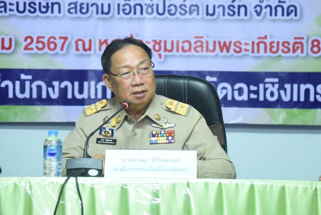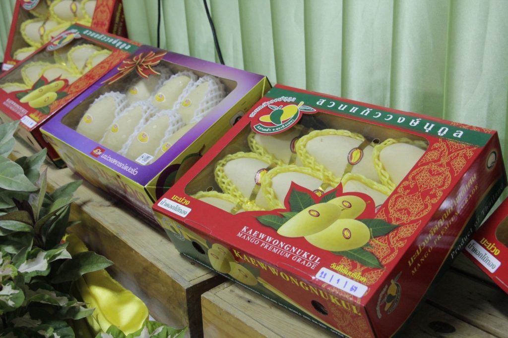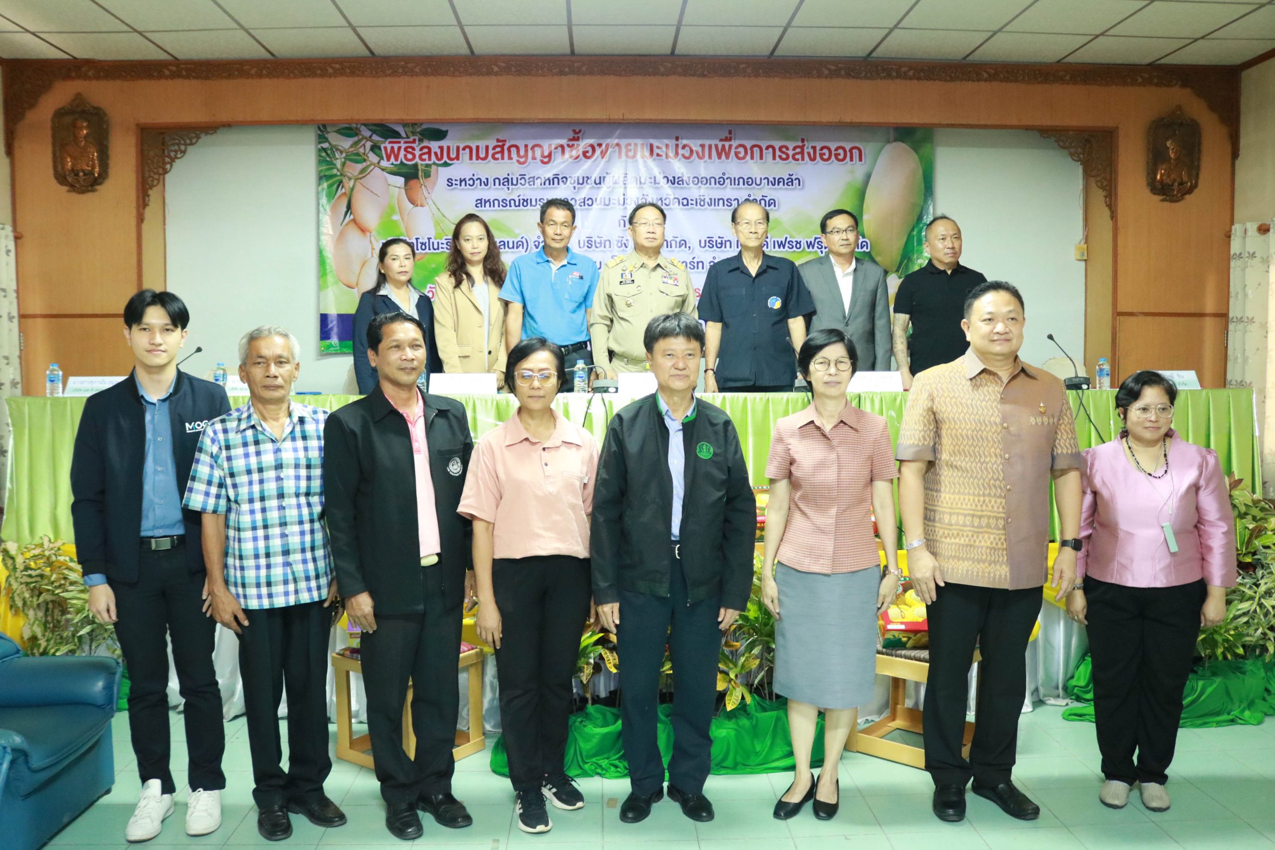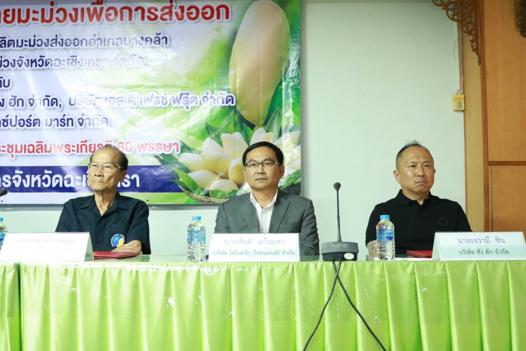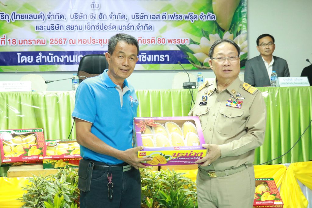 มะม่วงเป็นผลผลิตที่มีชื่อเสียงของจังหวัดฉะเชิงเทรา ซึ่งมีพื้นที่ปลูกกว่า 21,300 ไร่ ในเดือนมกราคม – พฤษภาคม เป็นช่วงที่ผลผลิตมะม่วงนอกฤดูและผลผลิตมะม่วงในฤดูของจังหวัดฉะเชิงเทราออกสู่ตลาด จังหวัดฉะเชิงเทรา จึงจัดพิธีลงนามสัญญาซื้อขายมะม่วงเพื่อการส่งออก ณ หอประชุมเฉลิมพระเกียรติ 80 พรรษา สำนักงานเกษตรจังหวัดฉะเชิงเทรา ซึ่งจัดให้เครือข่ายผู้ผลิตและผู้ส่งออกมะม่วงของจังหวัดฉะเชิงเทราลงนามสัญญาซื้อขายผลผลิต กิจกรรมประกอบด้วยการลงนามสัญญาซื้อขายผลผลิตมะม่วงระหว่างวิสาหกิจชุมชนผู้ผลิตมะม่วงส่งออกอำเภอบางคล้า กับบริษัท โซโนะริกุ (ไทยแลนด์) จำกัด บริษัท ซัง ฮัก จำกัด และบริษัท เอส ดี เฟรช ฟรุ๊ต จำกัดและการลงนามสัญญาซื้อขายผลผลิตมะม่วงระหว่างสหกรณ์ชมรมชาวสวนมะม่วงจังหวัดฉะเชิงเทรา จำกัด กับบริษัท สยาม เอ็กซ์ปอร์ต มาร์ท จำกัด รวมปริมาณผลผลิตกว่า 700 ตัน คิดเป็นมูลค่าไม่น้อยกว่า 40 ล้านบาท และการสัมมนาเครือข่ายผู้ผลิตและผู้ส่งออกมะม่วงของจังหวัดฉะเชิงเทรา เพื่อแลกเปลี่ยนข้อมูลสถานการณ์ในการผลิตและการตลาดมะม่วงที่สำคัญ ในการตัดสินใจของเกษตรกรชาวสวนมะม่วงพร้อมกระตุ้นการสร้างความเข้าใจในการผลิตมะม่วง ให้สอดคล้องกับความต้องการของตลาดทั้งด้านคุณภาพ และมาตรฐาน