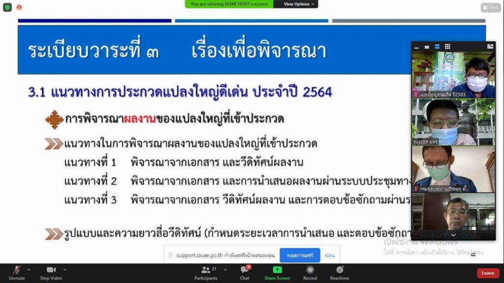 วันที่ 13 กรกฎาคม 2564 เวลา 08.30 น. นายชัชวาล ลิ้มประสิทธิศักดิ์ นักวิชาการส่งเสริมการเกษตรชำนาญการ มอบหมายให้ว่าที่ร้อยตรีรักพงษ์ วงศ์รอด นักวิชาการส่งเสริมการเกษตรปฏิบัติการ และนายประสิทธิ์ รูปต่ำ ประธานและผู้จัดการแปลงใหญ่ไผ่อำเภอท่าตะเกียบ (แปลงใหญ่ดีเด่นระดับประเทศ รางวัลชนะเลิศ ปี ๒๕๖๓)ร่วมประชุมคณะกรรมการตัดสินการประกวดแปลงใหญ่ดีเด่นระดับประเทศ ครั้งที่ ๑/๒๕๖๔ ผ่านระบบ Video Conference (Zoom Cloud Meeting) เพื่อเตรียมความพร้อมและซักซ้อมความเข้าใจในรูปแบบการประกวดแปลงใหญ่ดีเด่นระดับประเทศ ปี ๒๕๖๔ โดยมีนายขจร เราประเสริฐ รองอธิบดีกรมส่งเสริมการเกษตร เป็นประธานการประชุมฯ ณ ที่ทำการกลุ่มแปลงใหญ่ไผ่อำเภอท่าตะเกียบ หมู่ ๙ ตำบลท่าตะเกียบ อำเภอท่าตะเกียบ จังหวัดฉะเชิงเทรา