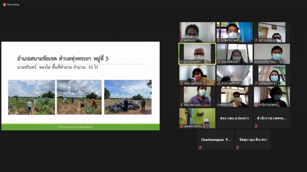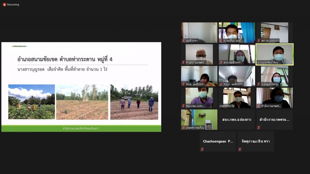 วันที่ 20 กรกฎาคม 2564 เวลา 13.30 น.นางเนาวรัตน์ ทิพย์สุวรรณ เกษตรอำเภอท่าตะเกียบ พร้อมด้วยนายวัชร ลิ้มวรรณดี นักวิชาการส่งเสริมการเกษตรชำนาญการ เข้าร่วมการประชุมคณะทำงานขับเคลื่อนการแก้ไขปัญหาโรคใบด่างมันสำปะหลัง ระดับจังหวัด ครั้บที่ 1/2564 ผ่านระบบ Zoom เพื่อพิจารณาเกษตรกรที่เข้าร่วมโครงการเพิ่มประสิทธิภาพการควบคุมโรคใบด่างมันสำปะหลังแบบครอบคลุมพื้นที่ ณ สำนักงานเกษตรอำเภอท่าตะเกียบ จังหวัดฉะเชิงเทรา