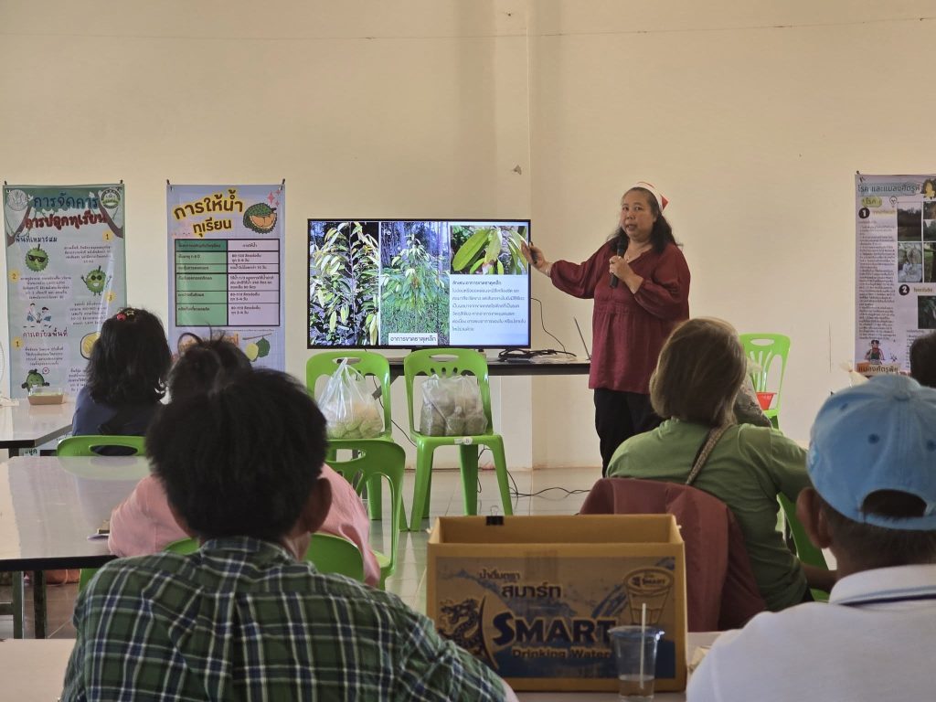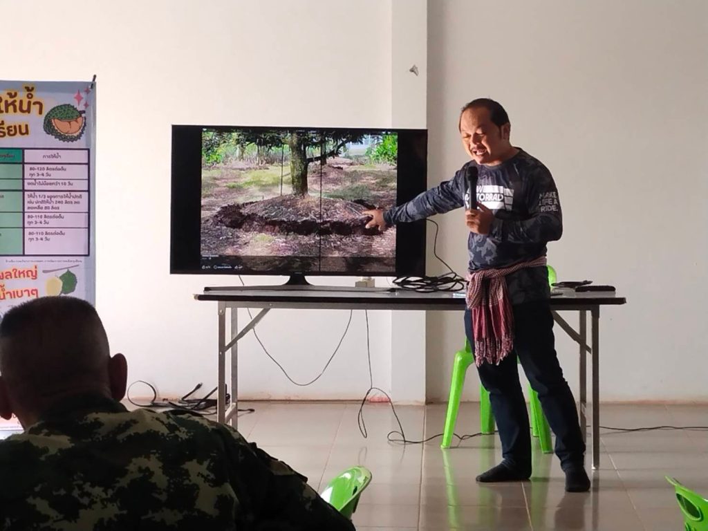 วันที่ 25 ธันวาคม 2567 นางเนาวรัตน์ ทิพสุวรรณ์ เกษตรอำเภอท่าตะเกียบ มอบหมายให้นางสาวสโรชา โคสัมปัตติ นักวิชาการส่งเสริมการเกษตรปฏิบัติการ และนายสิทธิกร แสนอ้วน นักวิชาการส่งเสริมการเกษตร จัดเวทีแห่งการเรียนรู้ ภายใต้โครงการระบบส่งเสริมเกษตรแบบแปลงใหญ่ เพื่อปรับเพิ่มผลิตภาพการผลิต กิจกรรมพัฒนาคุณภาพมาตรฐานสินค้าเกษตรในแปลงใหญ่ เป้าหมายเกษตรกรแปลงใหญ่ทุเรียน จำนวน 30 ราย ในพื้นที่อำเภอท่าตะเกียบ โดยมี นายวสันต์ รื่นรมย์ นายกสมาคมทุเรียน และเจ้าหน้าที่ศูนย์ส่งเสริมเทคโนโลยีการเกษตรด้านอารักขาพืช จังหวัดชลบุรี ร่วมเป็นวิทยากรถ่ายทอดความรู้ให้แก่เกษตรกร ณ ห้องประชุมสํานักงานเกษตรอำเภอท่าตะเกียบ จังหวัดฉะเชิงเทรา
